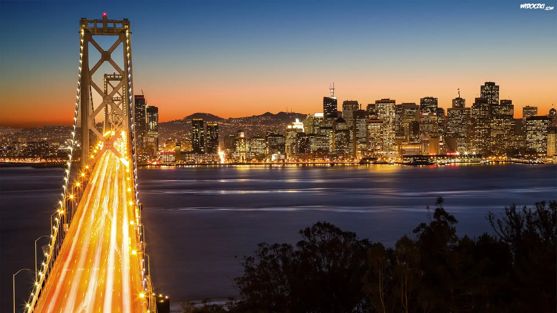 Zdjęcia, Rzeka, Oświetlony, Most, Drapacze, Chmur