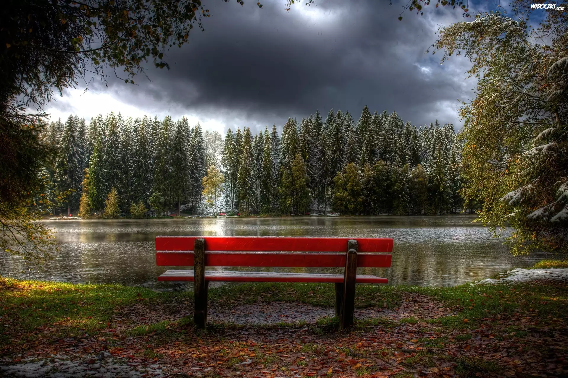 Zdjęcia, Rzeka, Ławeczka, Drzewa, Chmury