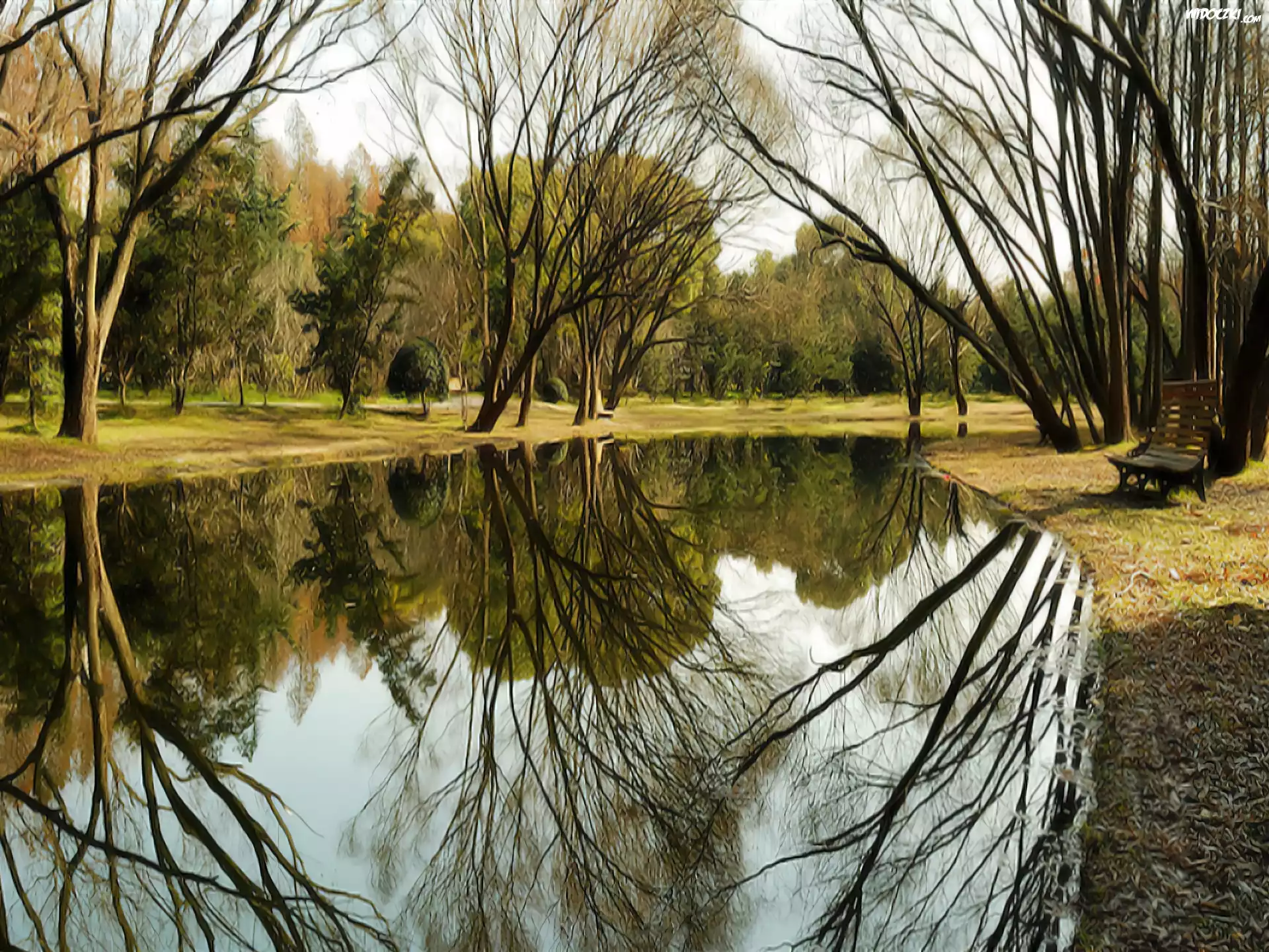 Zdjęcia, Rzeka, Park, Ławka, Drzewa, Odbicie