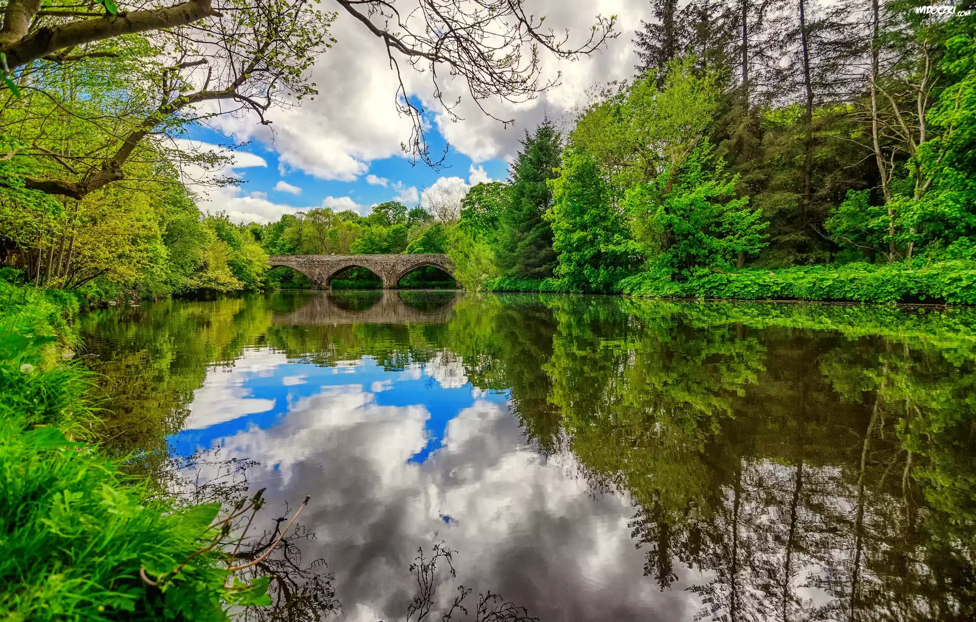 Rzeka, Most, Chmury, Drzewa, Odbicie
