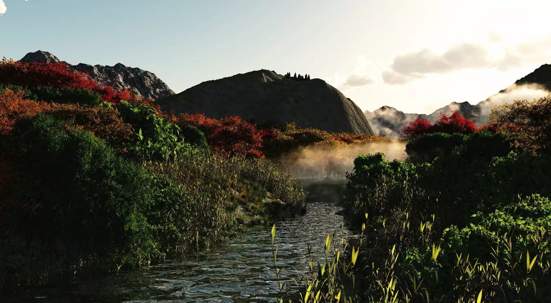 Rzeka, Górki, Drzewa, Mgła