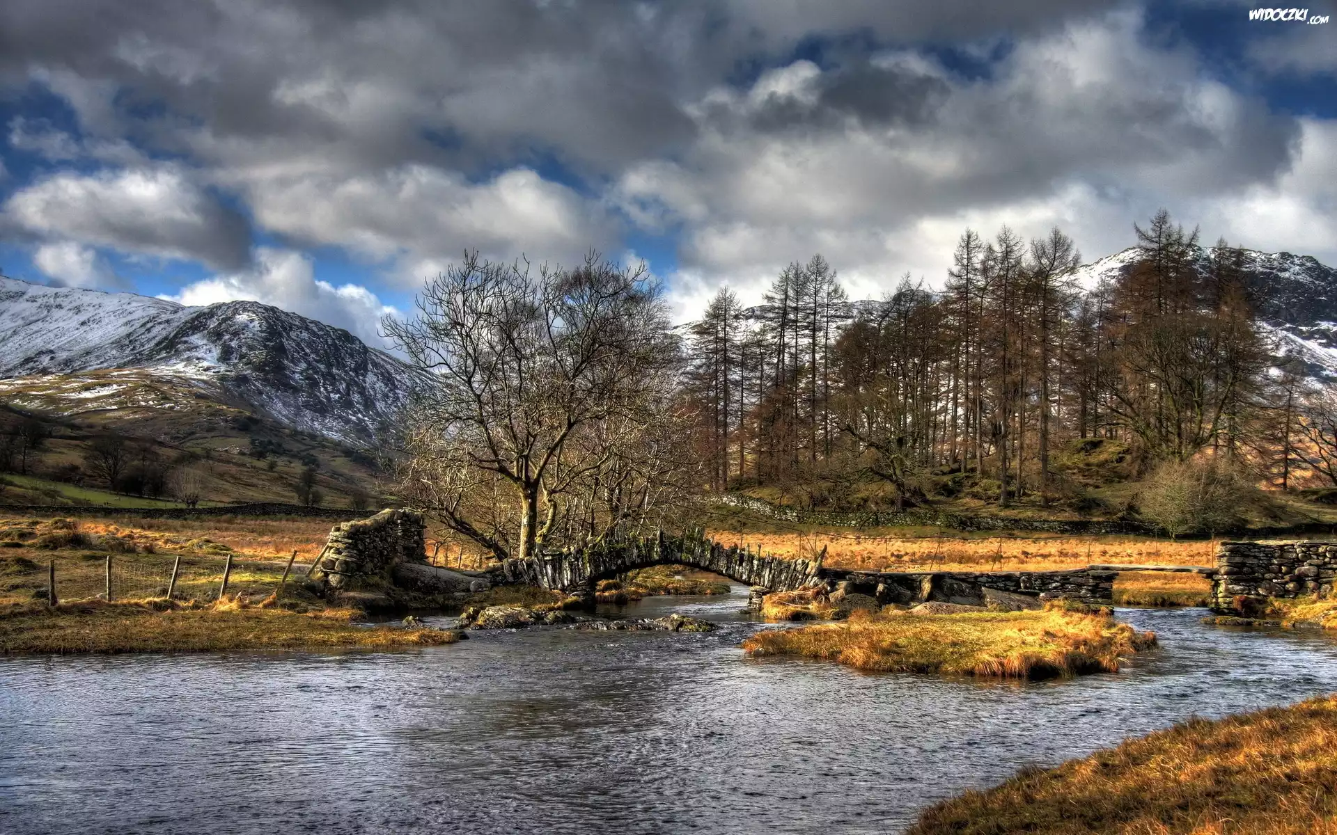 Zdjęcia, Rzeka, Góry, Drzewa, Chmury