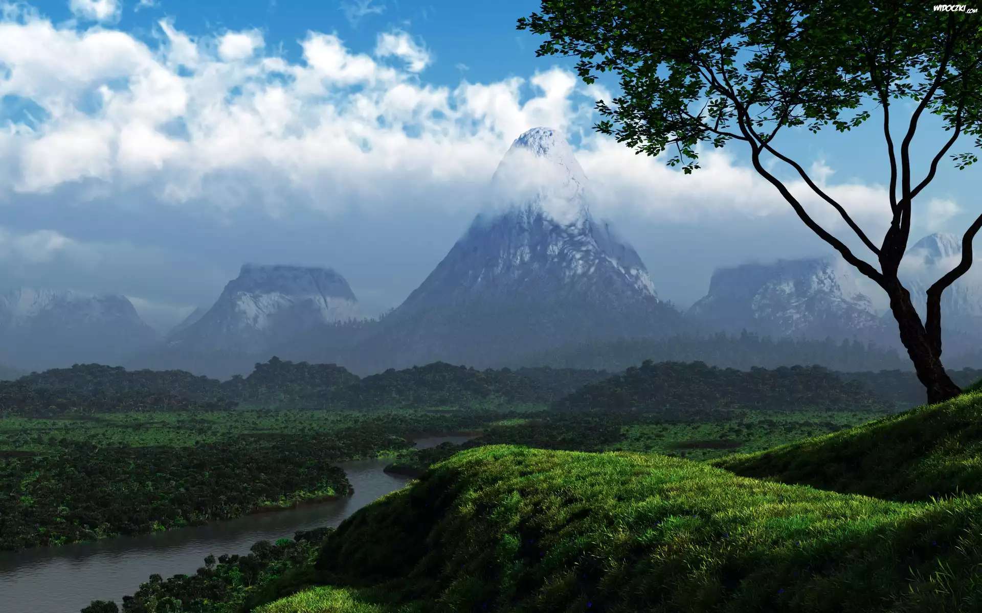 Zdjęcia, Rzeka, Góry, Drzewa, Chmury