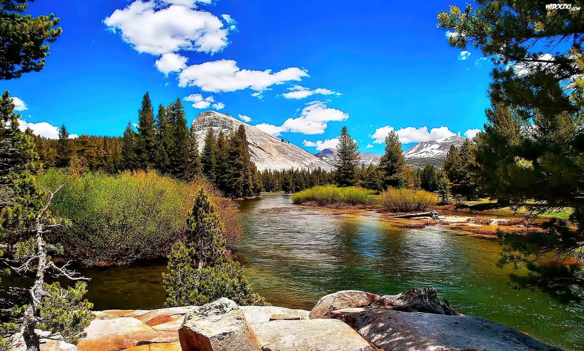 Zdjęcia, Rzeka, Góry, Drzewa, Kamienie