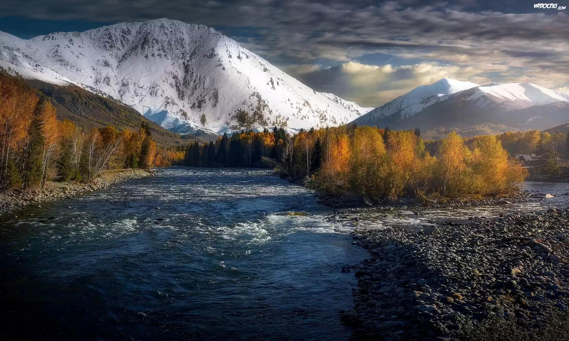 Zdjęcia, Rzeka, Ośnieżone, Góry, Śnieg, Drzewa, Kamienie