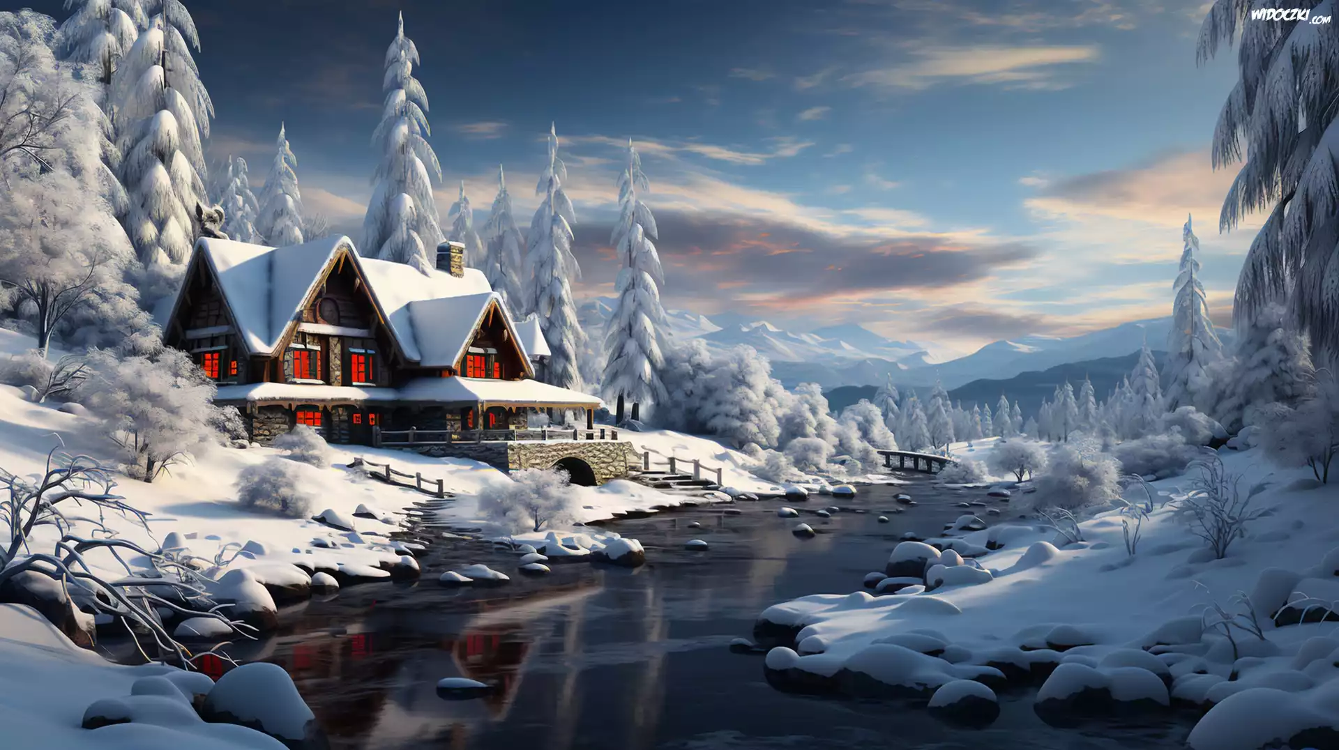 Zdj臋cia, Zima, Rzeka, Drzewa, Dom, Grafika