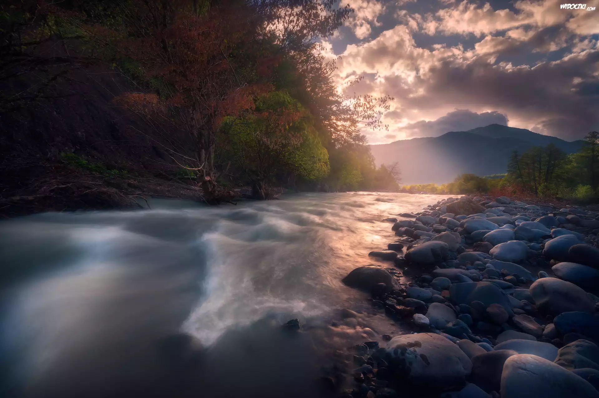 Zdjęcia, Rzeka, Poranek, Kamienie, Drzewa, Chmury
