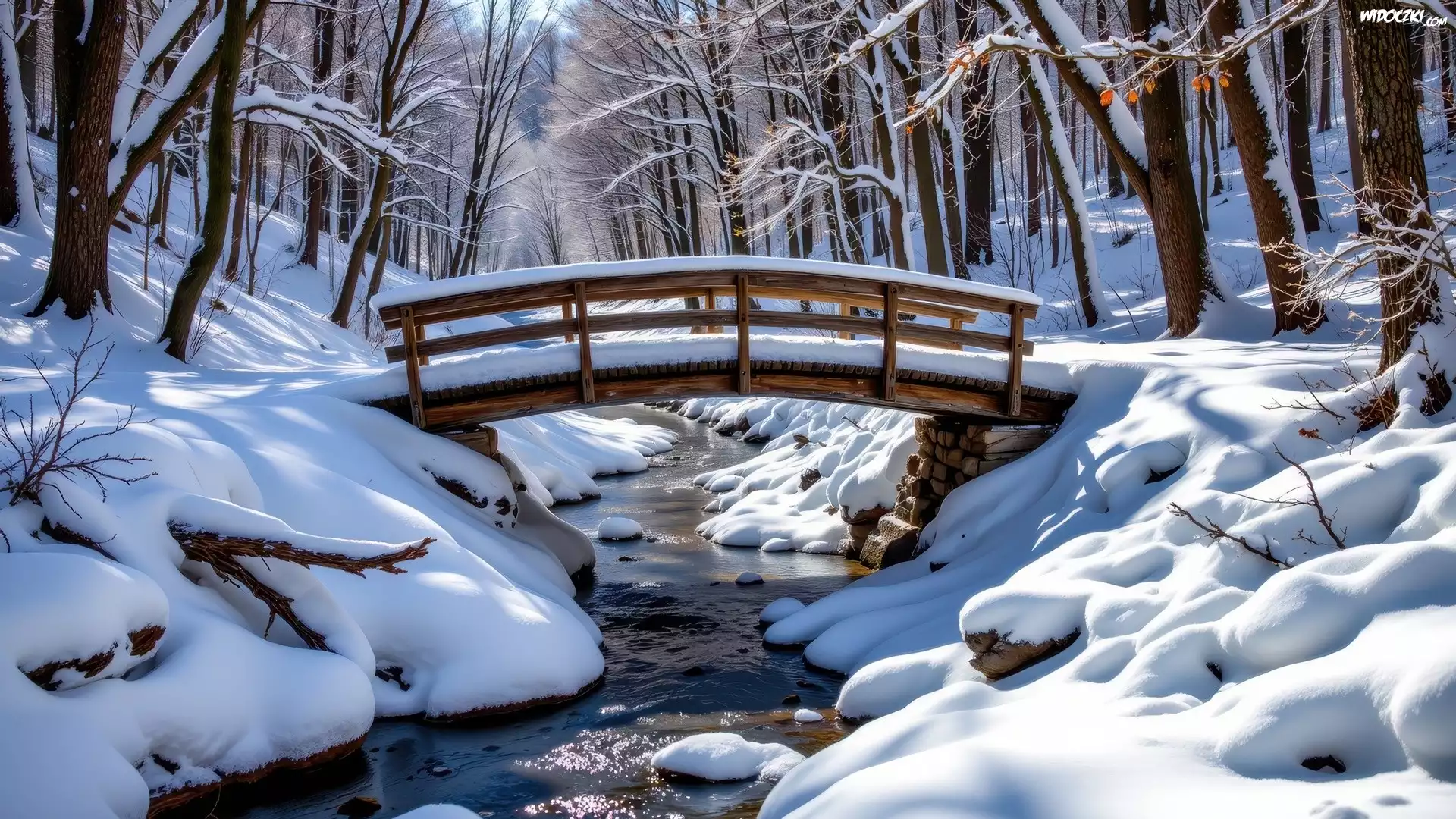 Zdjęcia, Zima, Las, Drzewa, Rzeka, Ośnieżony, Drewniany, Most