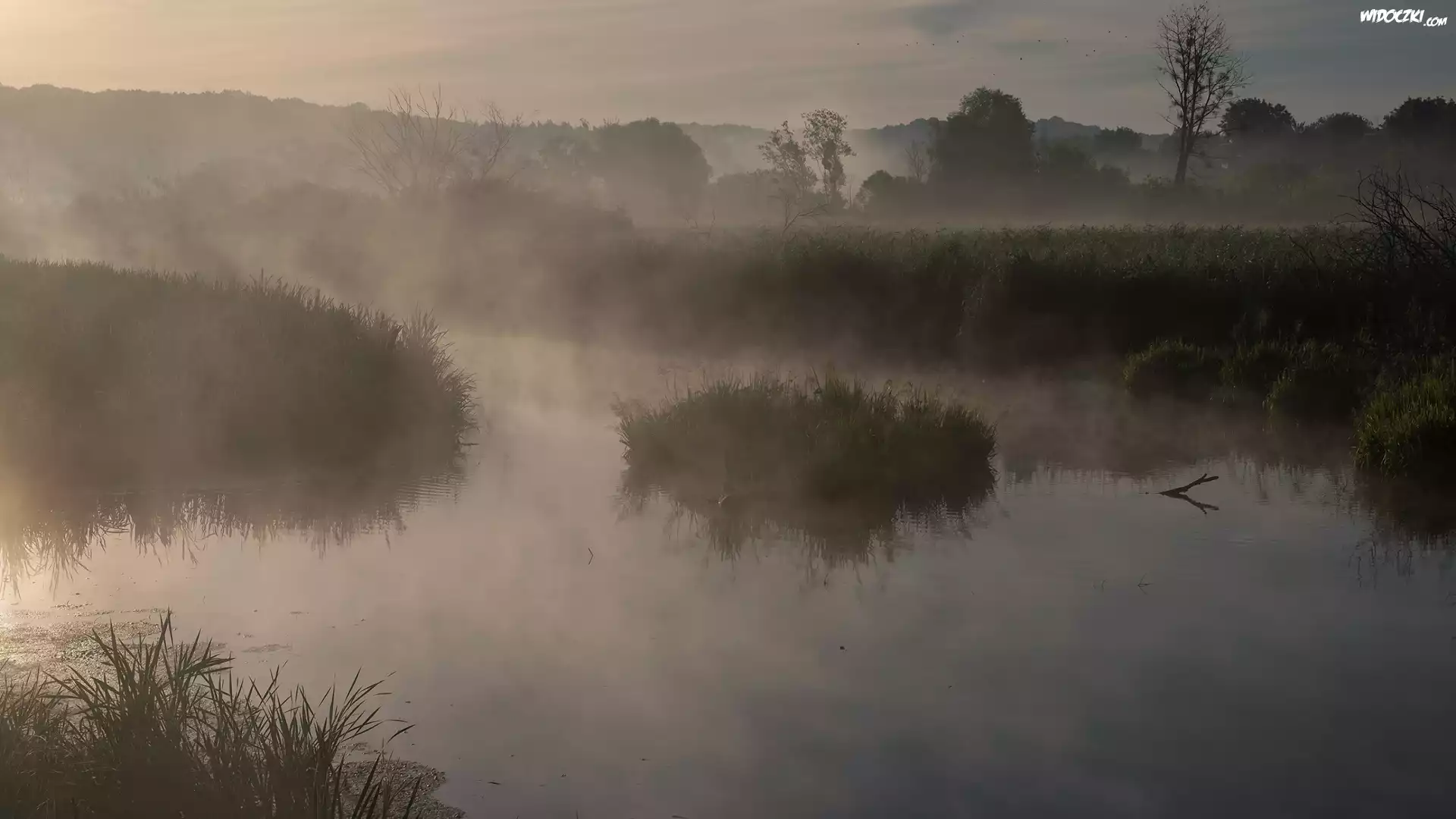 Zdjęcia, Rzeka, Mgła, Drzewa, Trawa