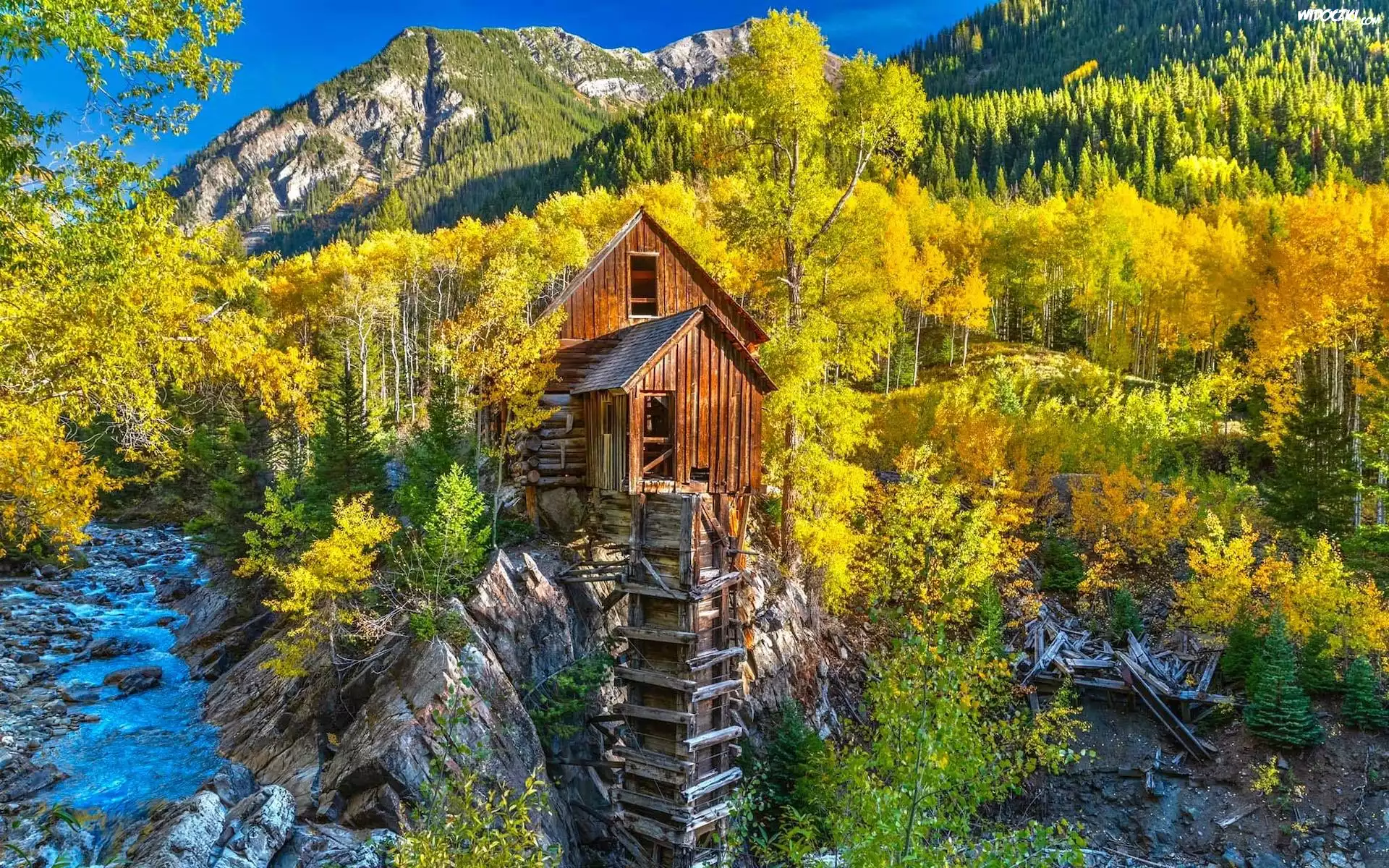 Zdjęcia, Młyn, Crystal Mill, Rzeka, Crystal River, Góry, Jesień, Skały, Drzewa, Kolorado, Stany Zjednoczone