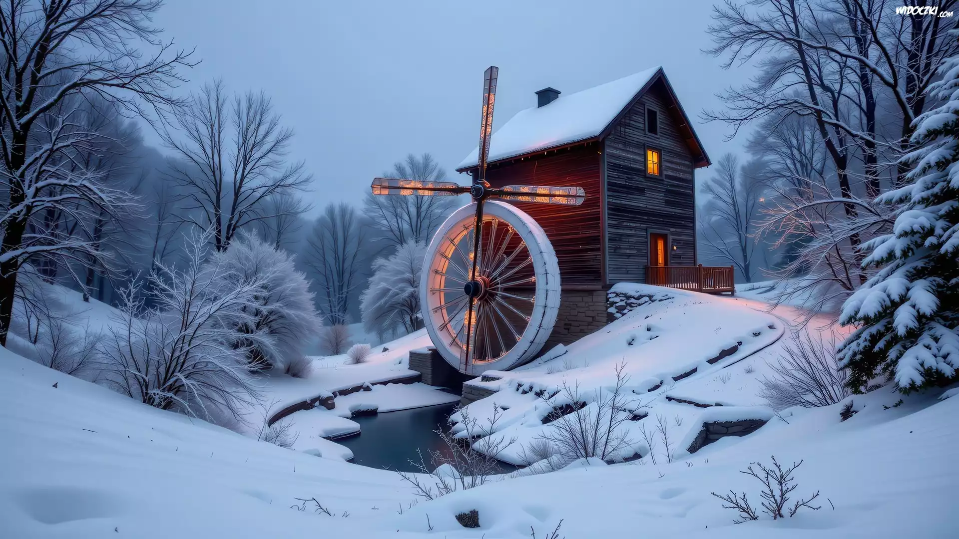 Zdjęcia, Zima, Śnieg, Młyn, Rzeka, Ośnieżone, Drzewa