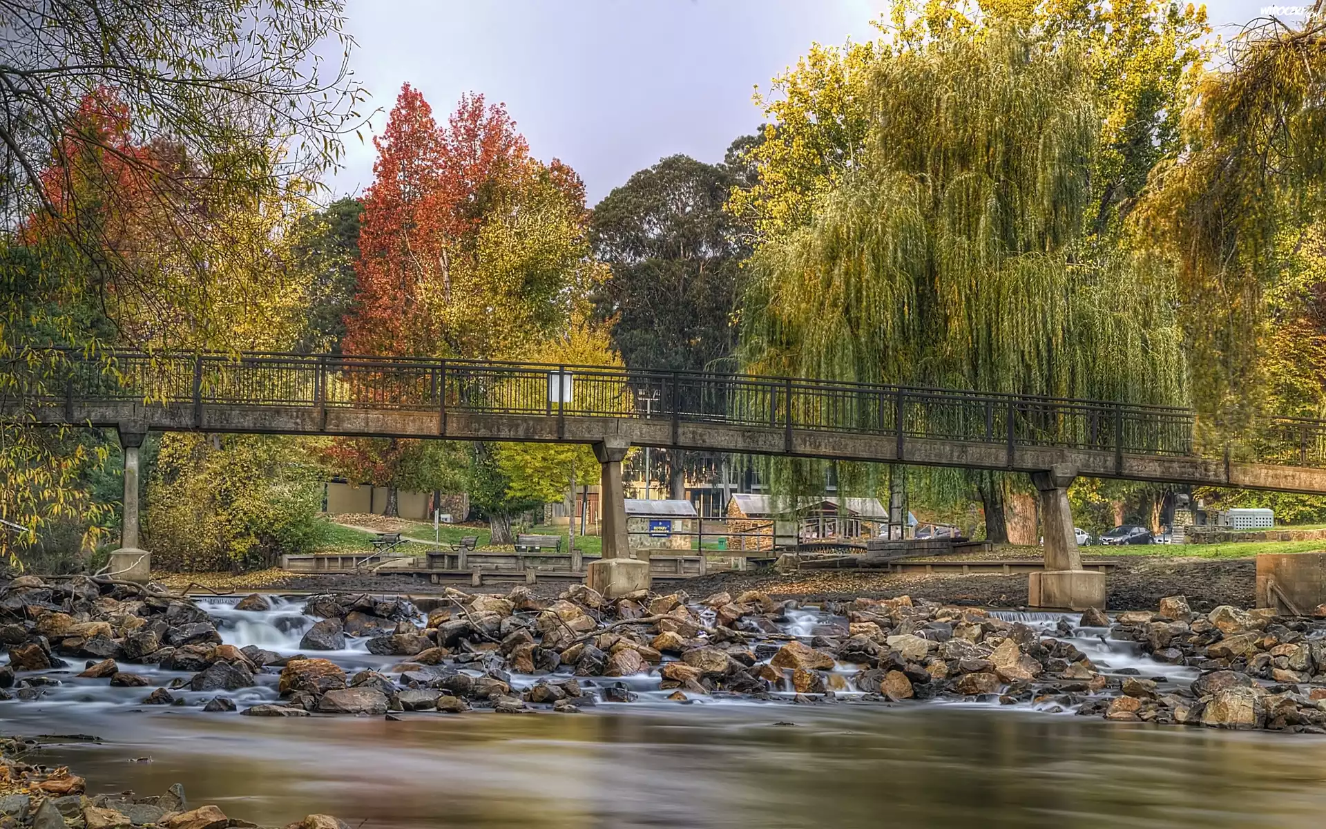 Rzeka, Kamienie, Most, Drzewa, Budynki