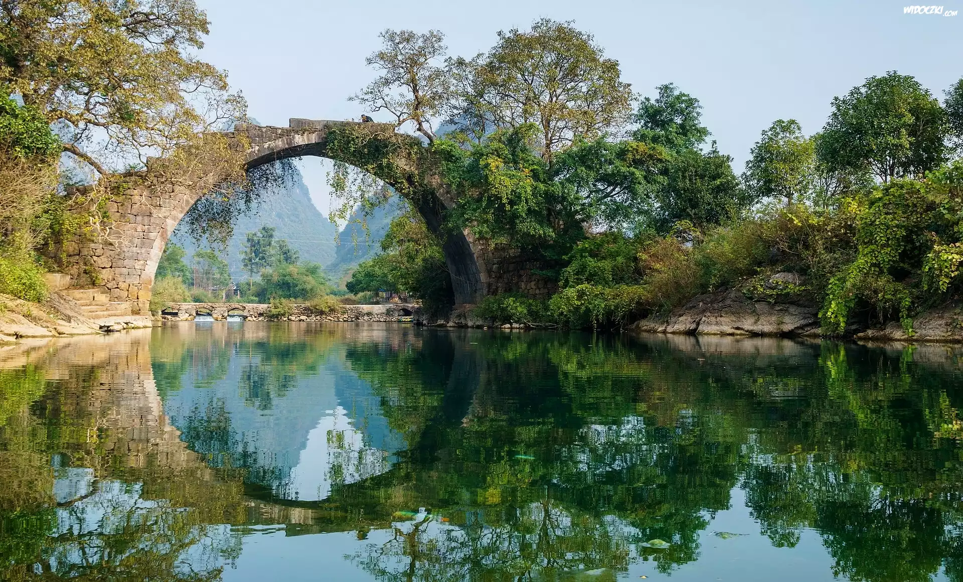 Zdjęcia, Rzeka, Kamienny, Most łukowy, Drzewa, Odbicie