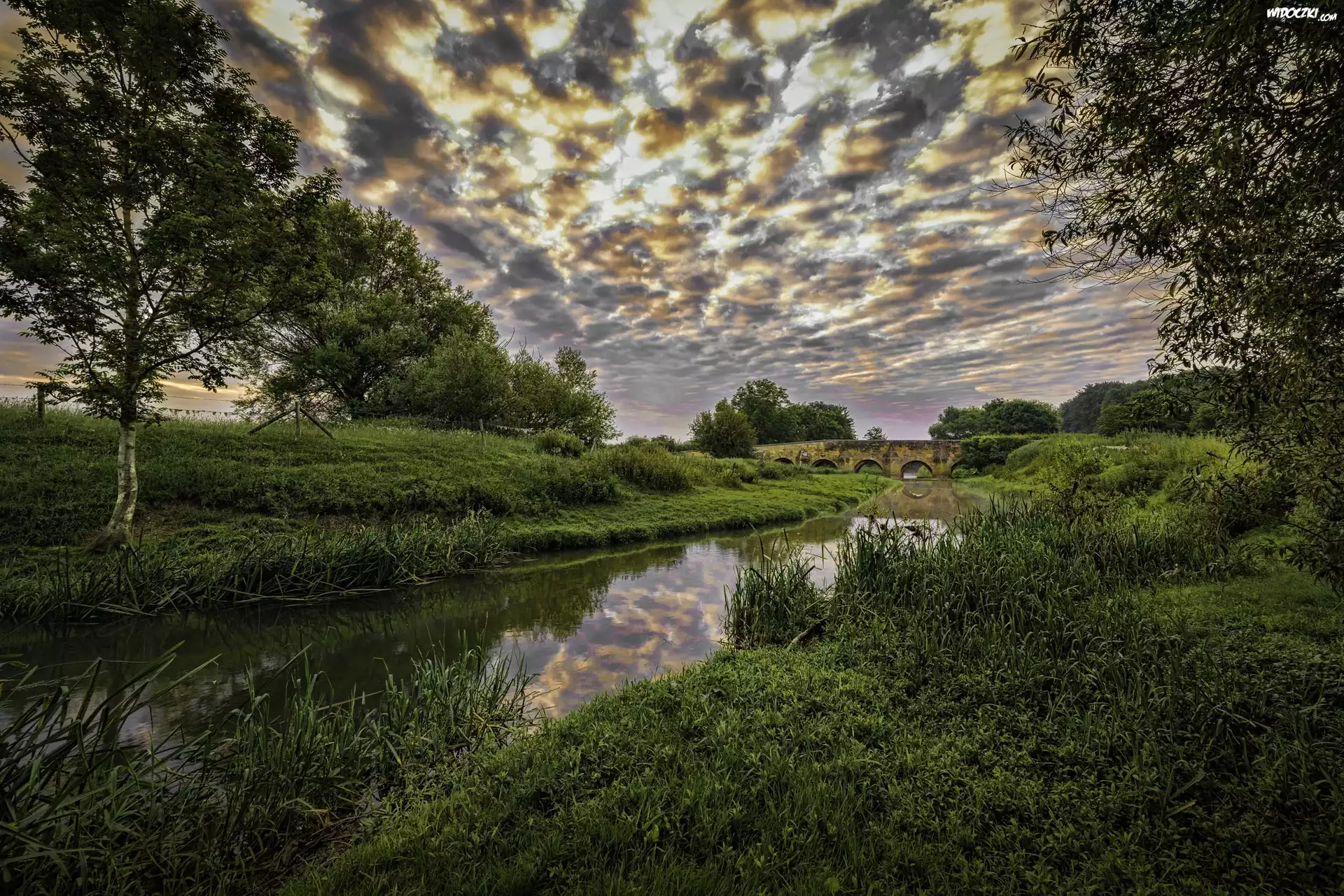 Zdjęcia, Rzeka, Chmury, Most, Mostek, Drzewa, Trawa