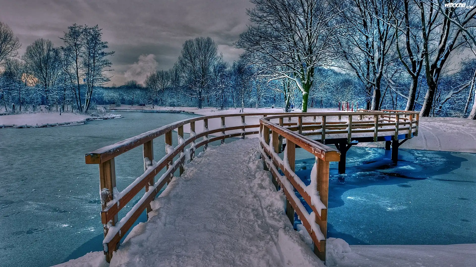 Zdjęcia, Rzeka, Mostek, Drzewa, Śnieg