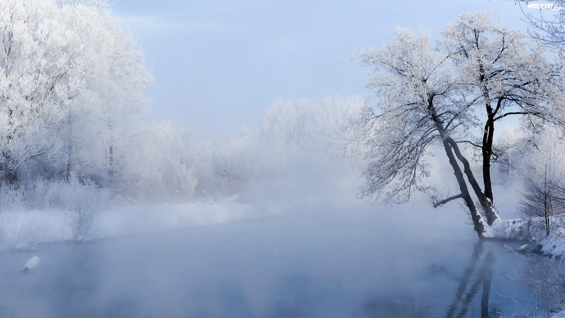 Zdjęcia, Rzeka, Mgła, Ośnieżone, Drzewa, Zima
