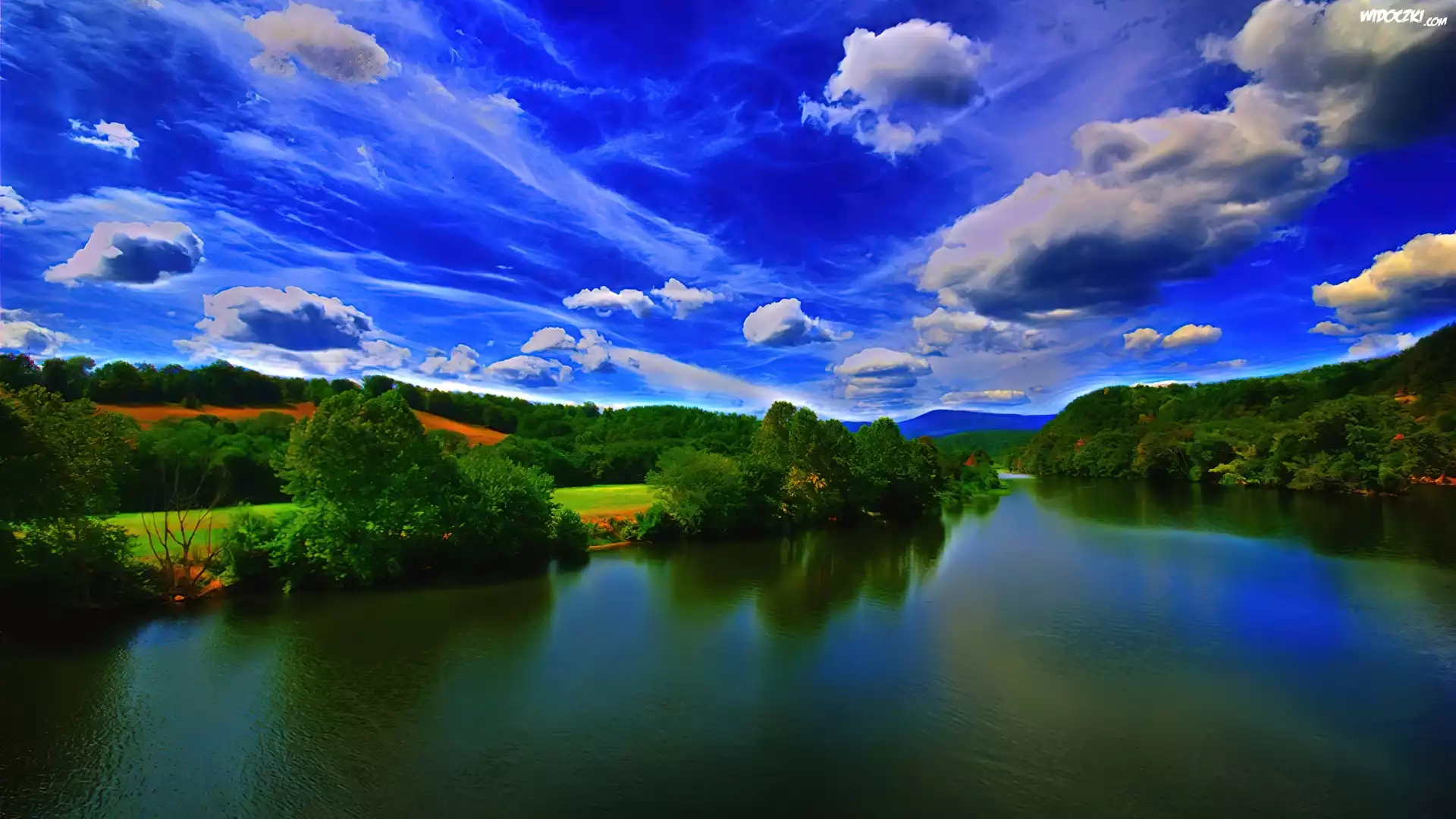 Zdjęcia, Rzeka, Pagórki, Drzewa, Chmury