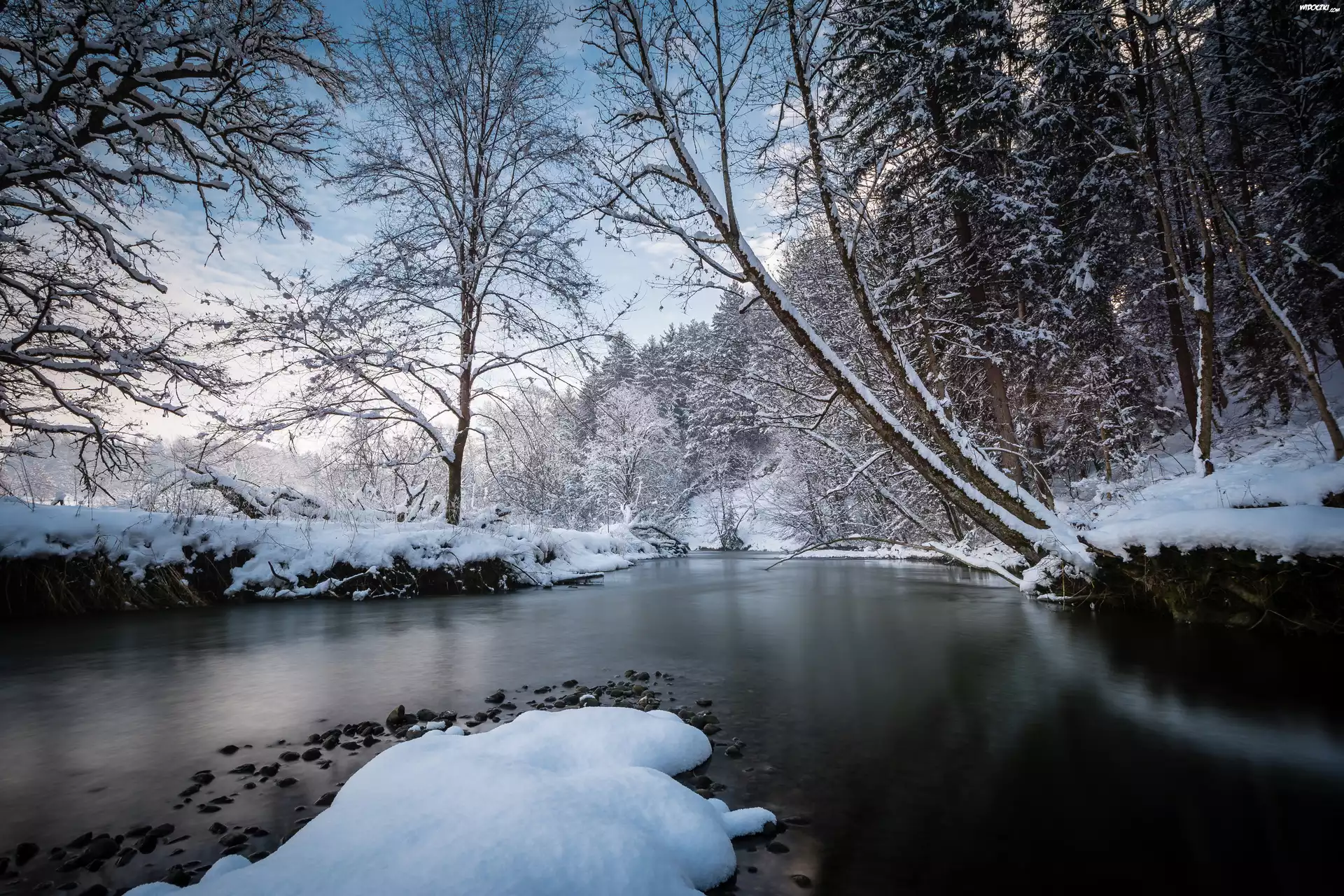 Zdjęcia, Rzeka, Las, Pochylone, Drzewa, Zima