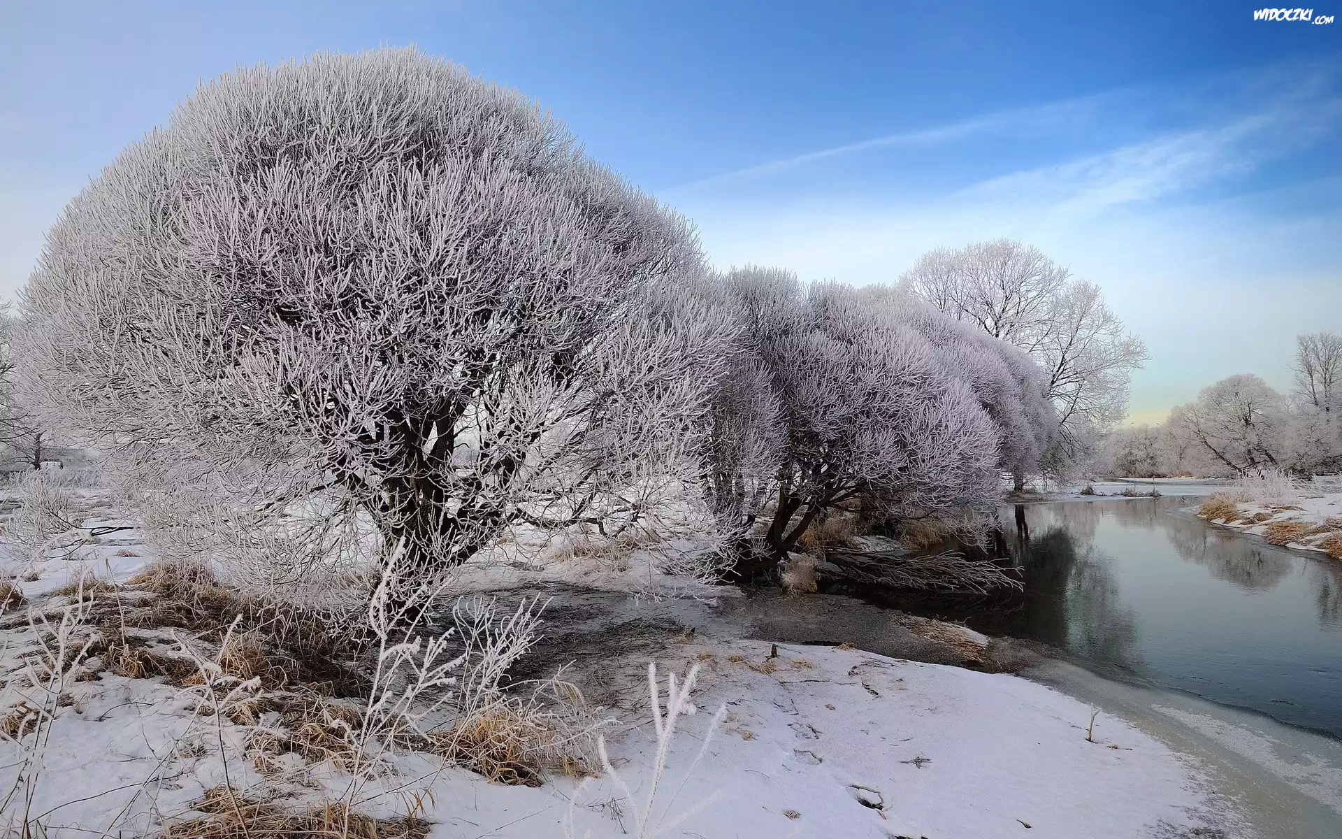 Rzeka, Pola, Drzewa, Zima
