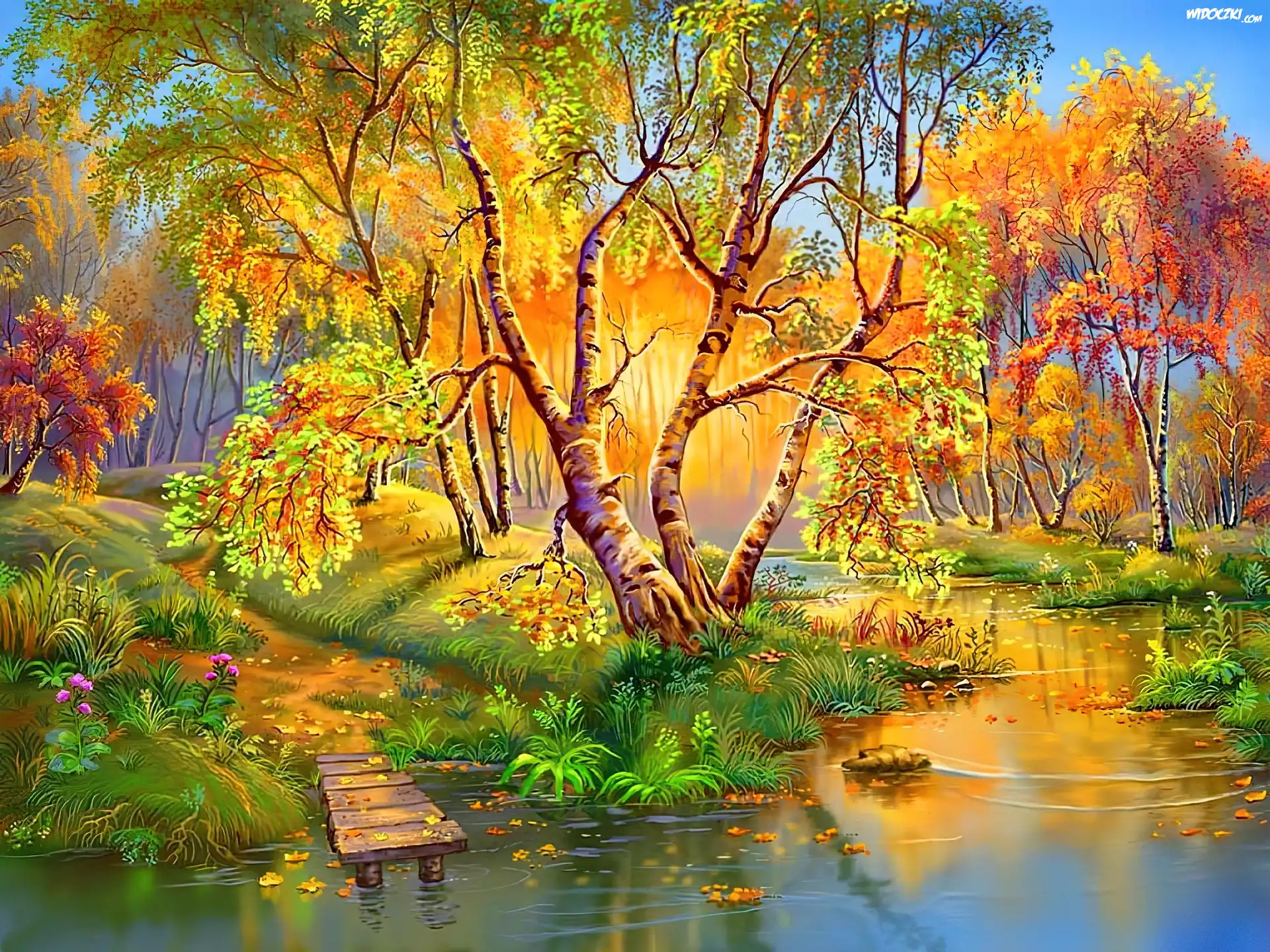 Rzeka, Kładka, Pomost, Drzewa, Jesień
