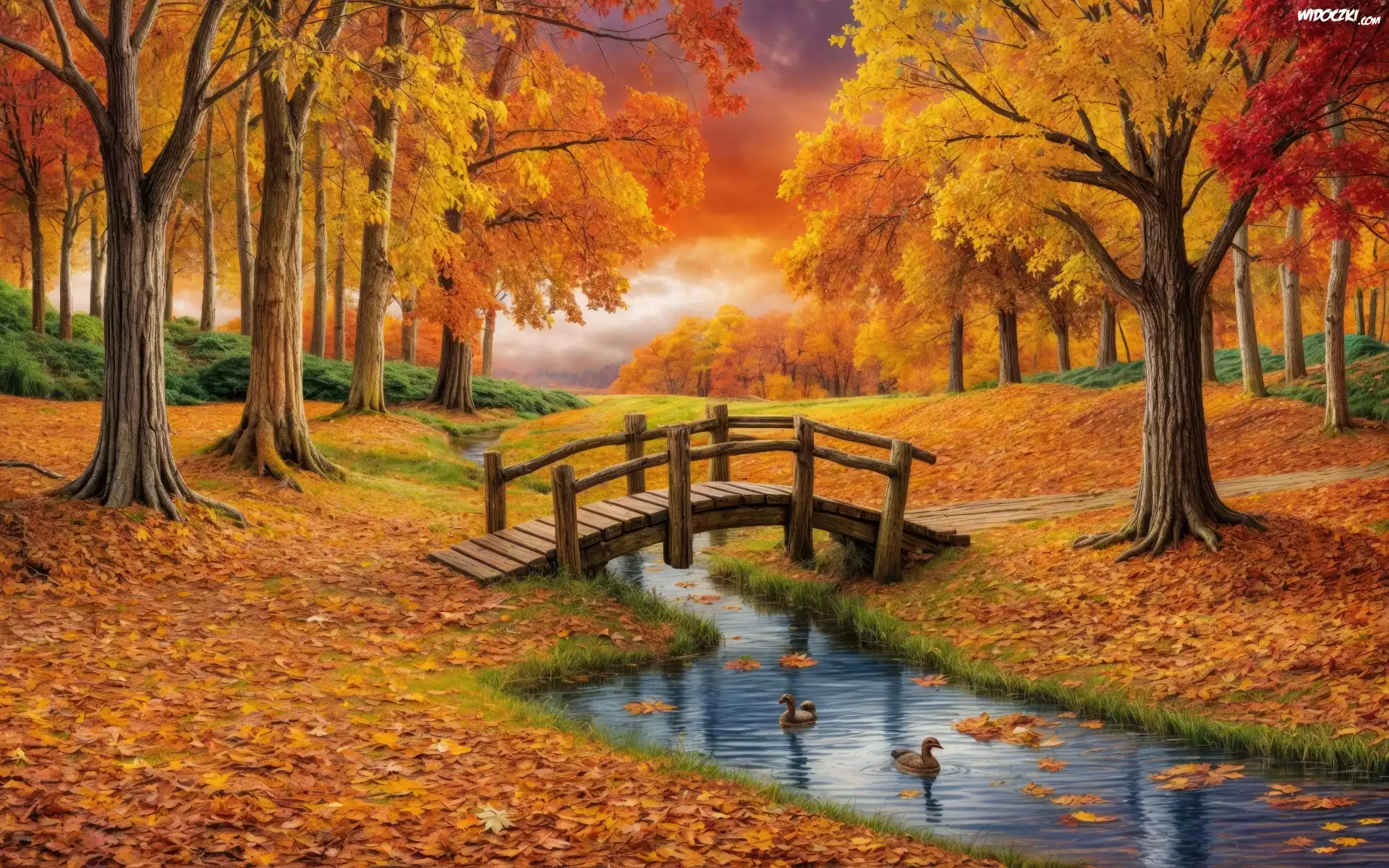 Jesień, Pożółkłe, Drzewa, Rzeka, Strumień, Most, Grafika