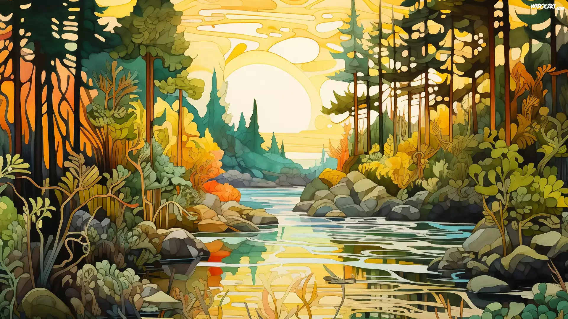 Grafika, Rzeka, Drzewa, Kamienie, Rośliny