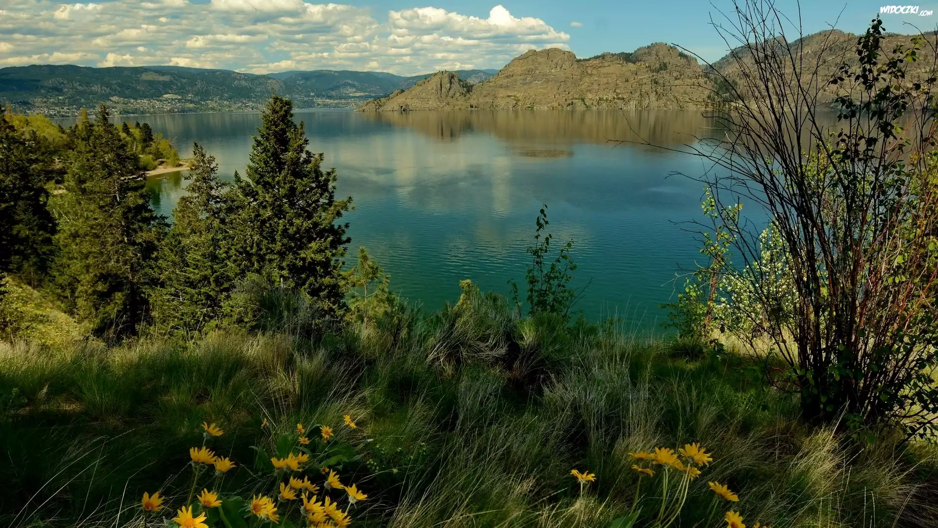 Zdjęcia, Rzeka, Wzgórza, Rośliny, Drzewa, Kwiaty