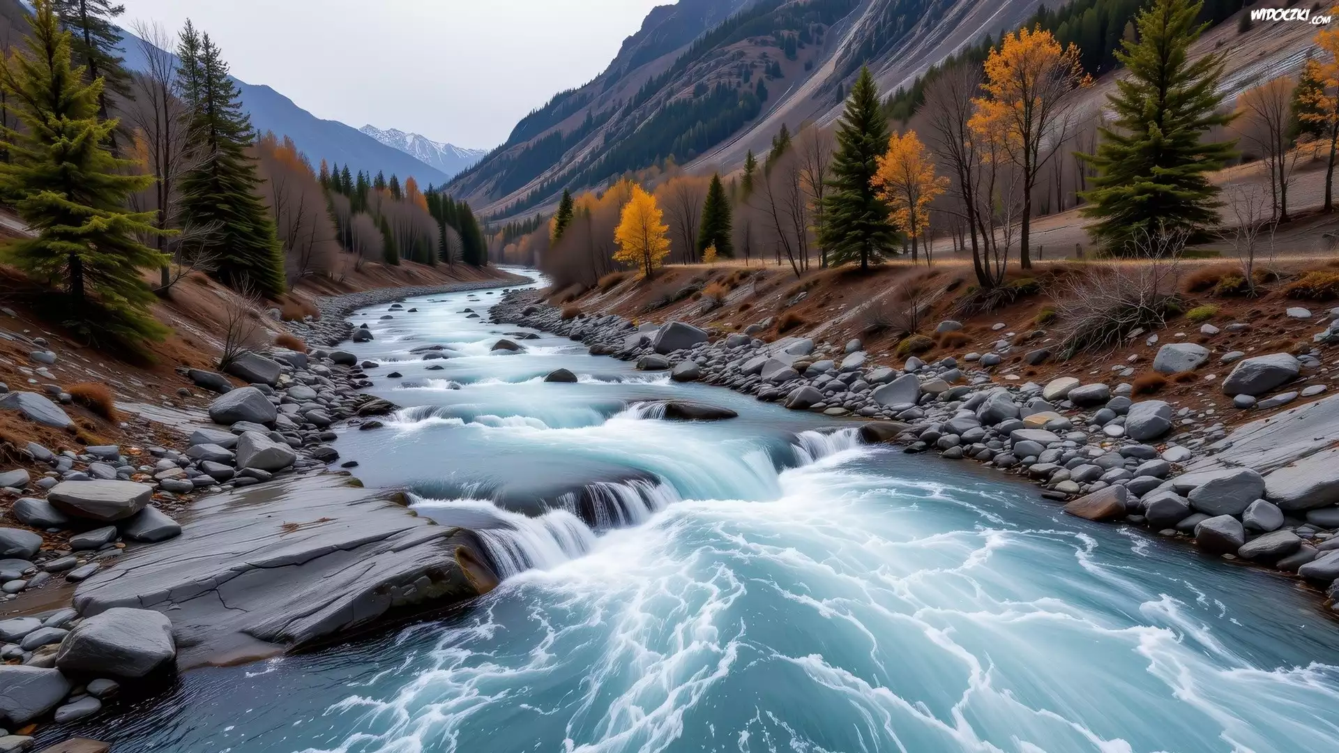 Jesień, Góry, Rwąca, Rzeka, Kamienie, Drzewa
