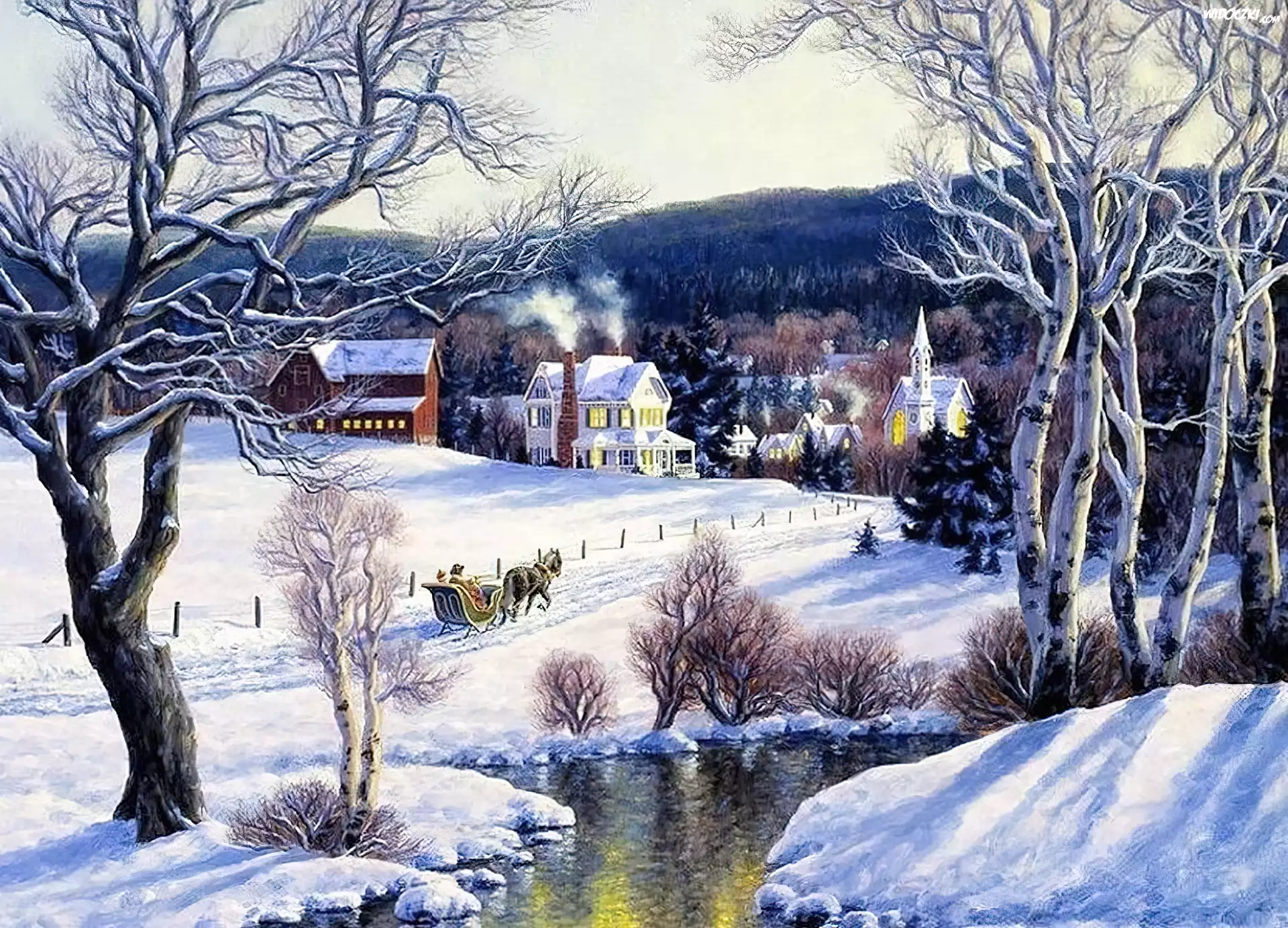 Rzeka, Droga, Sanie, Drzewa, Zima
