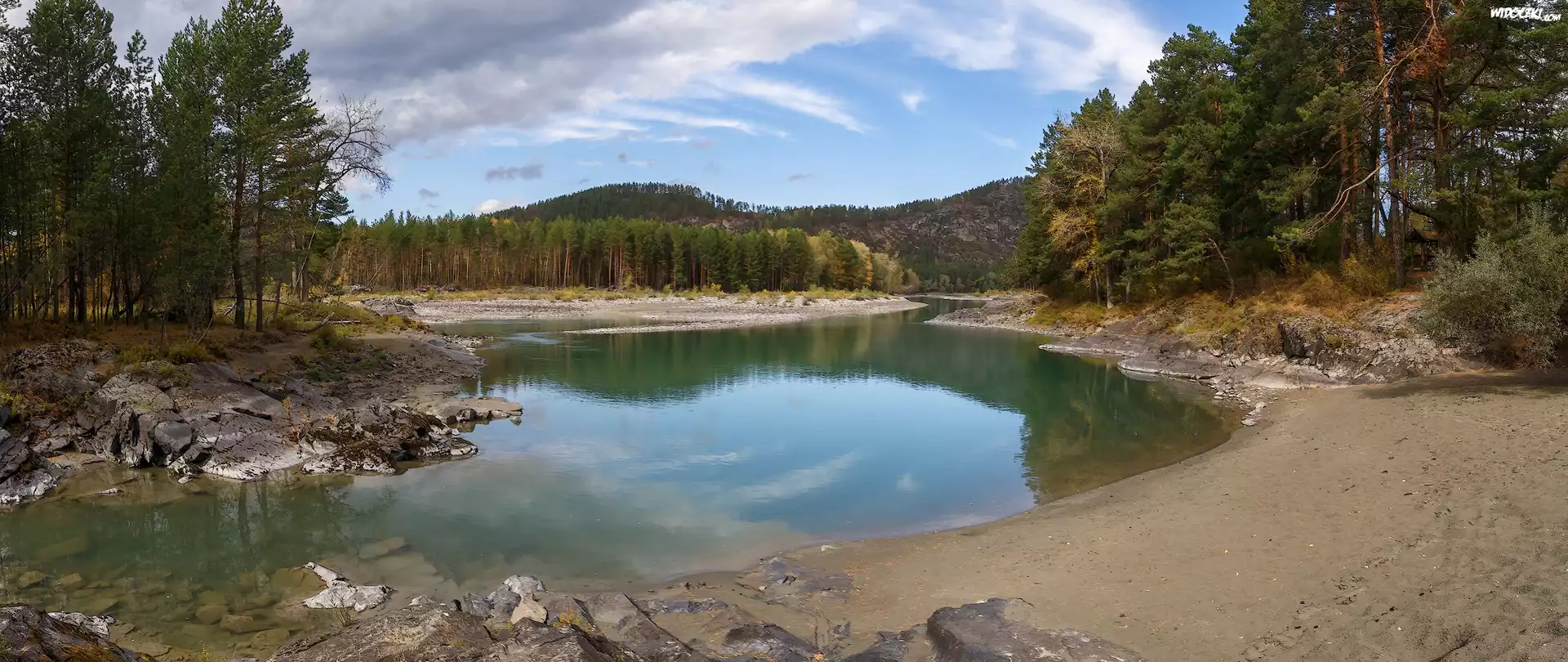 Rzeka, Góry, Skały, Drzewa, Sosny