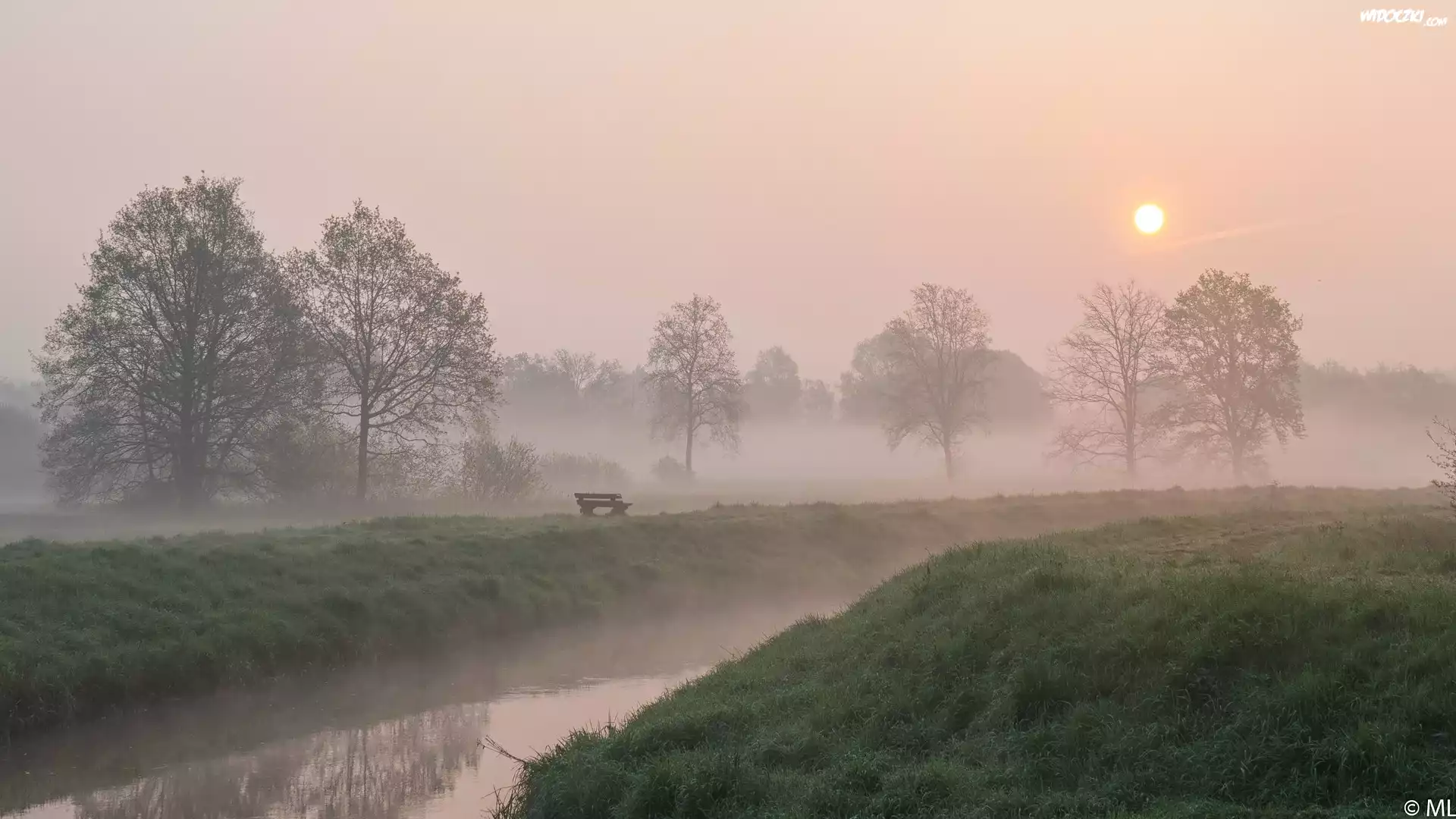 Rzeka, Wschód słońca, Mgła, Drzewa, Ławka
