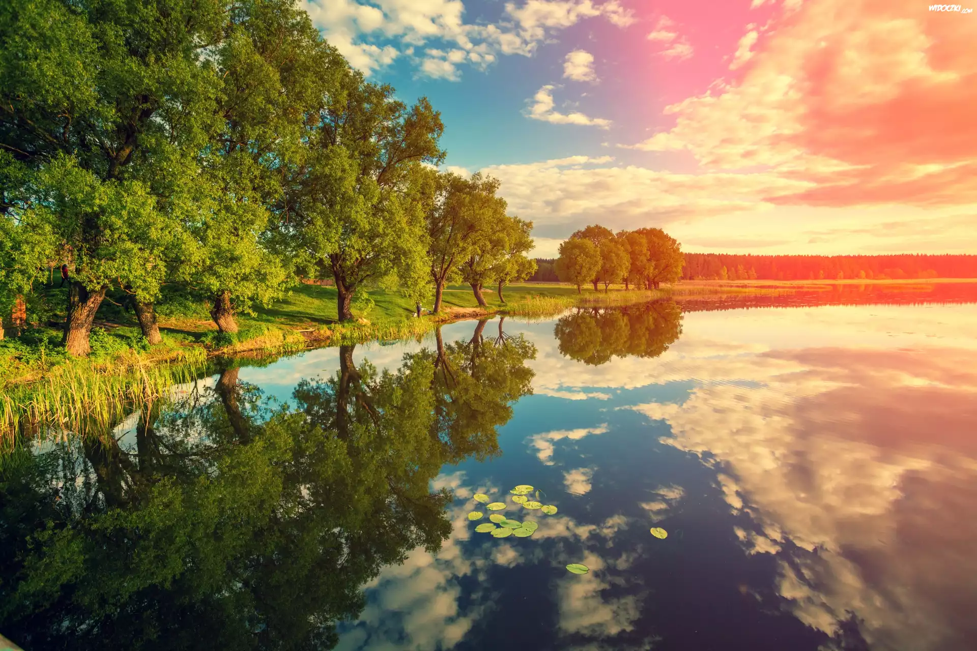 Rzeka, Wschód słońca, Drzewa, Odbicie