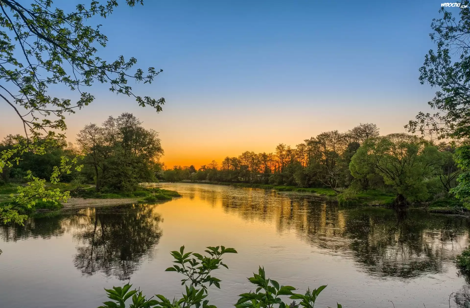 Zdjęcia, Rzeka, Wschód, Słońca, Drzewa, Roślinność