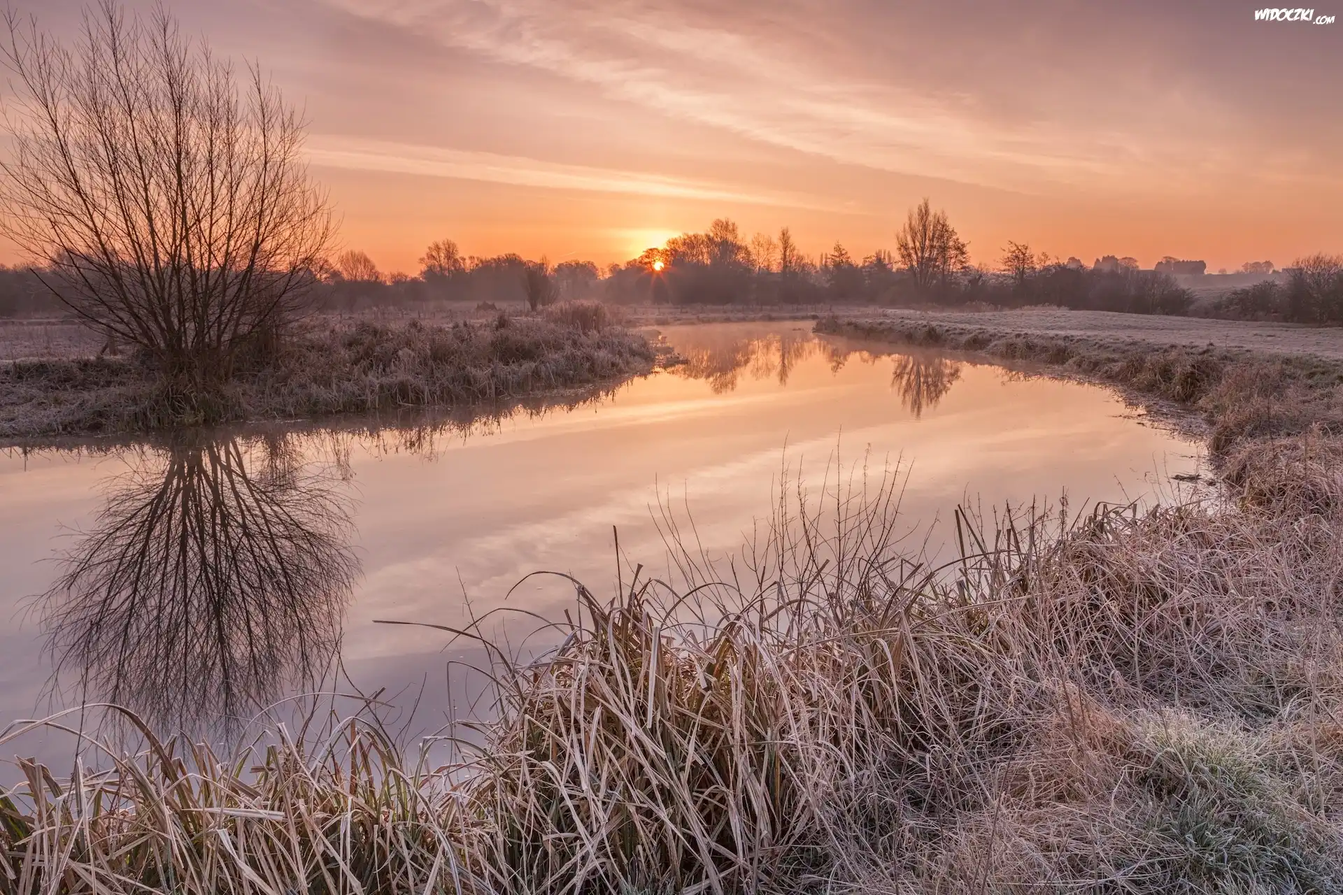 Zdjęcia, Rzeka, Zachód, Słońca, Drzewa, Szadź