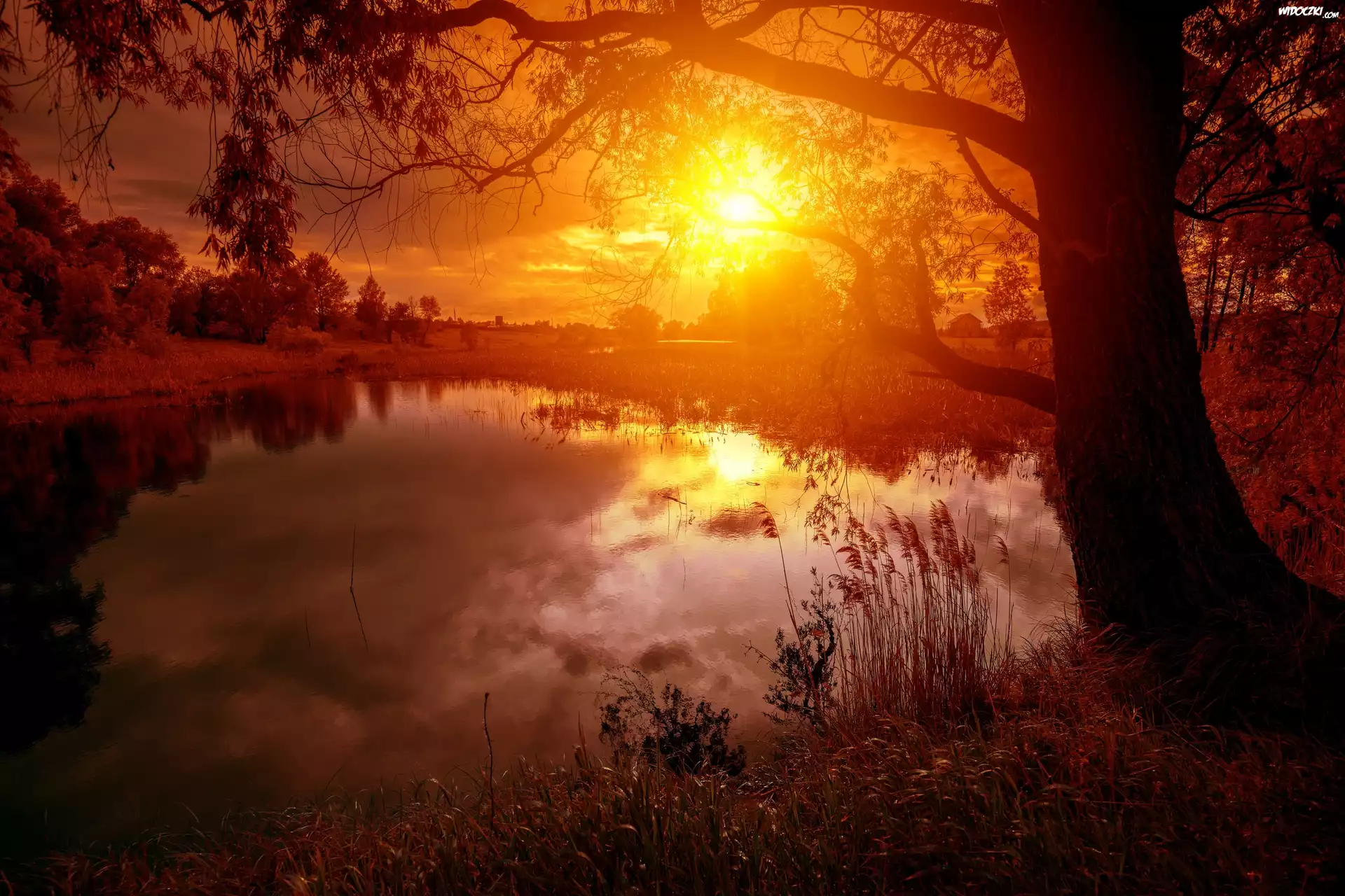 Rzeka, Zachód słońca, Drzewa, Trawa
