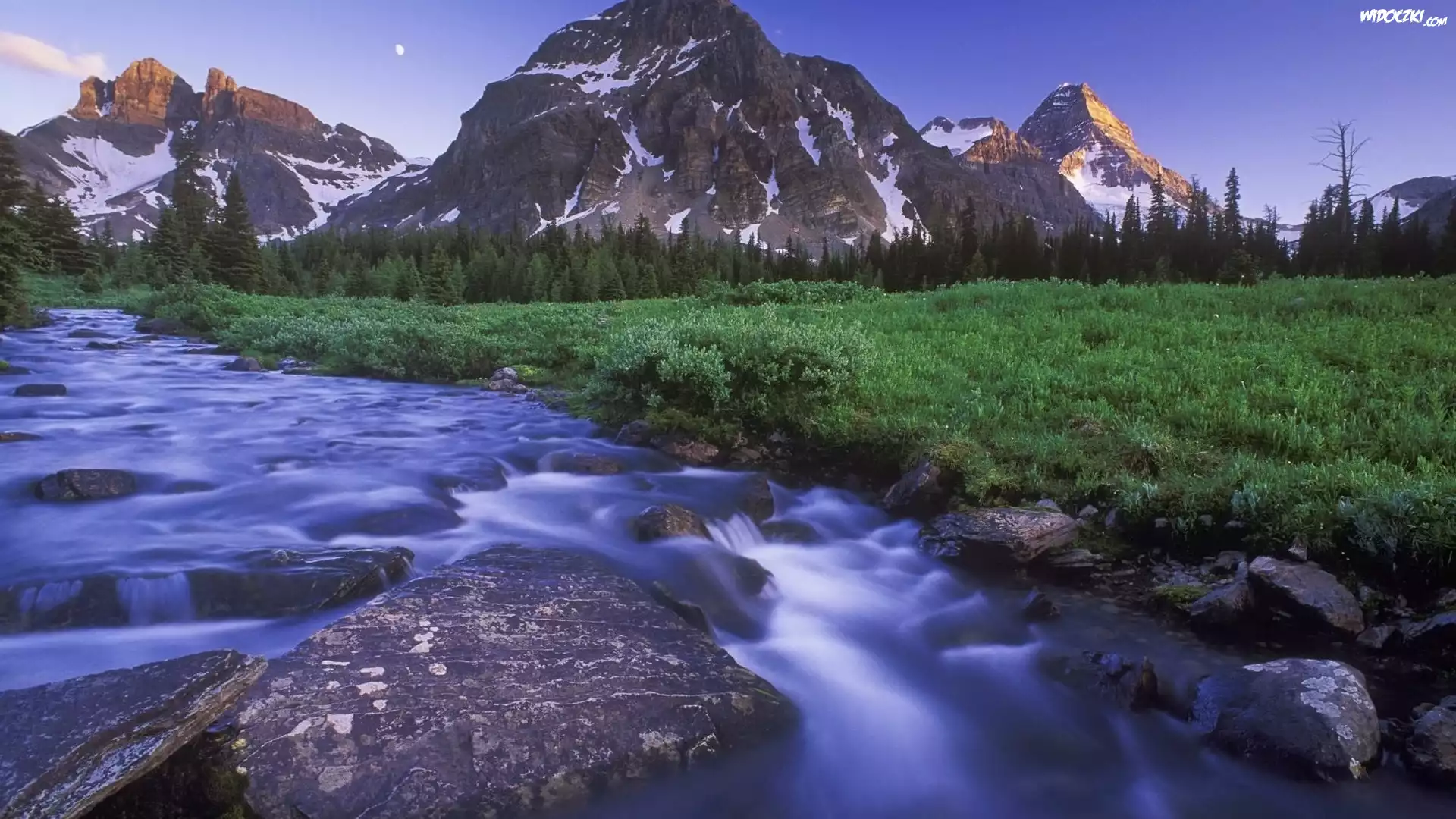 Zdjęcia, Rzeka, Trawa, Drzewa, Góry
