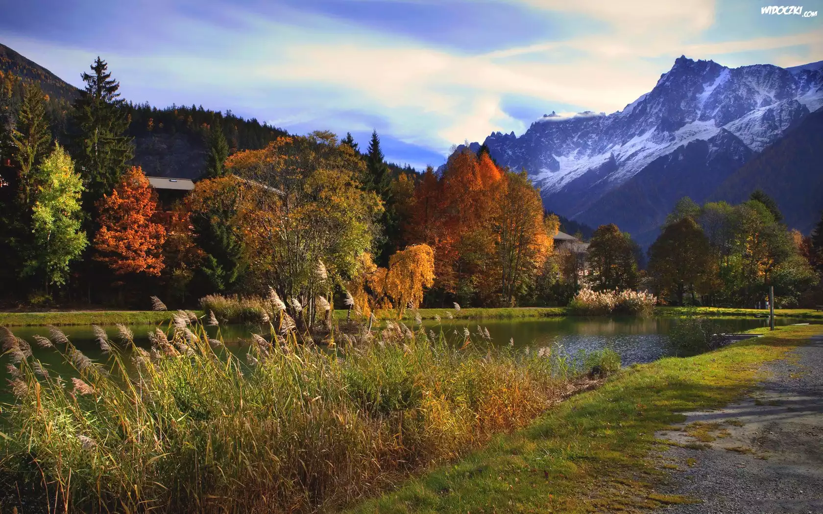 Zdjęcia, Rzeka, Trzciny, Drzewa, Góry