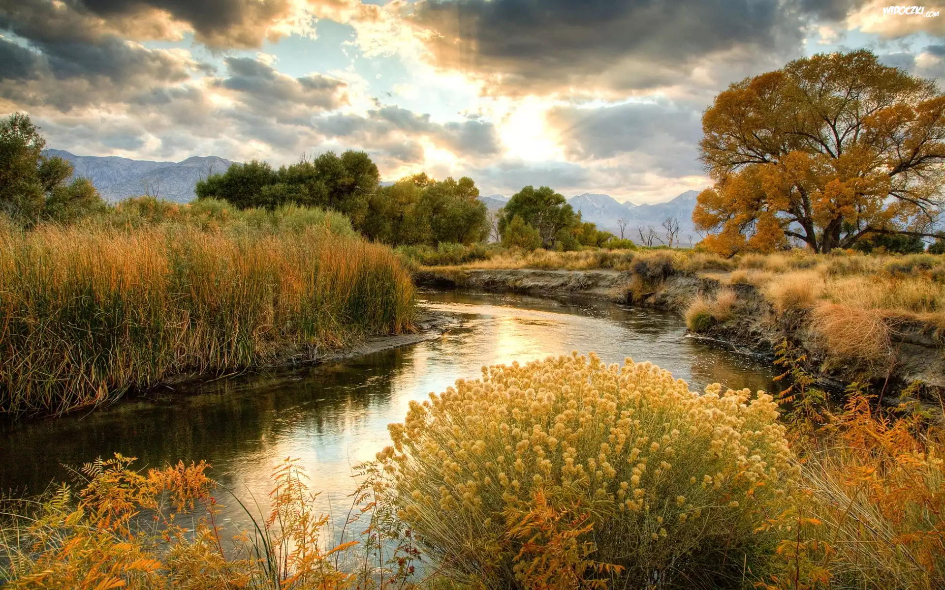 Góry, Rzeka, Zachód, Słońca Jesienny, Mglisty, Poranek Zachód Słońca, Chmura Zima, Drzewa, Szron, Rzeka Kaskada, Na, Rzece, Kłoda Zielone, Połacie, Pól, Białe, Obłoki Wodospad, Chmury Jezioro, Drzewa, Krajobraz Czerwone, Domki, Wąska, Rzeczka Jezioro, Góry, Chmury, Odbicie Rzeczka, Mostek, Drzewa Wiosna, Most, Rzeka, Kwiaty Zachód Słońca, Zatoka, Łódki Odbicie, Rzeka