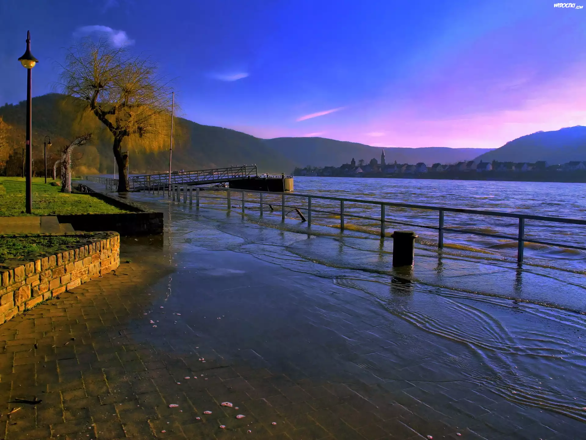 Zdjęcia, Rzeka, Ogrodzenie, Chodnik, Drzewo, Góry