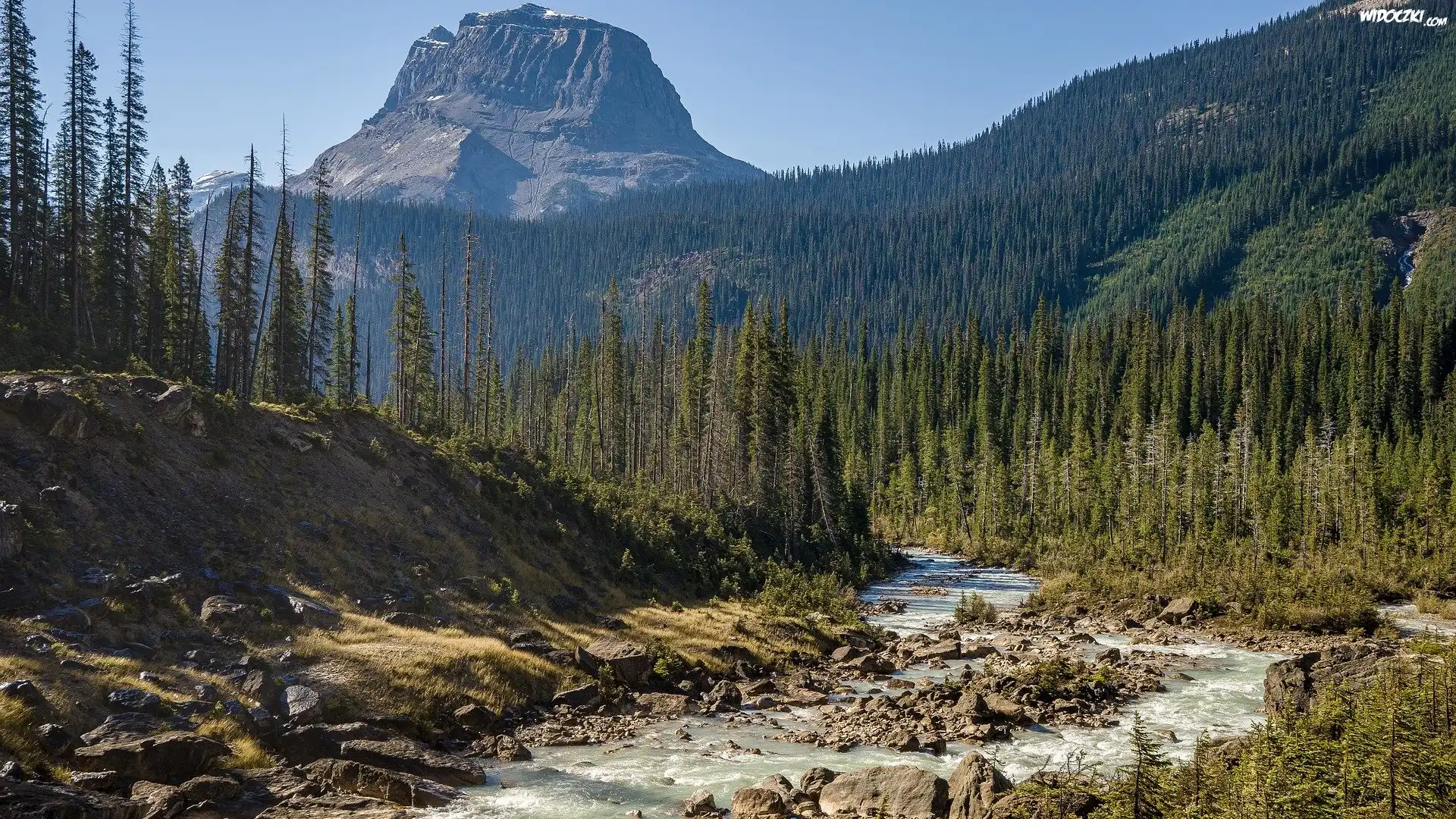 Zdjęcia, Góra, Wapta Mountain, Drzewa, Świerki, Rzeka, Park Narodowy Yoho, Kolumbia Brytyjska, Kanada