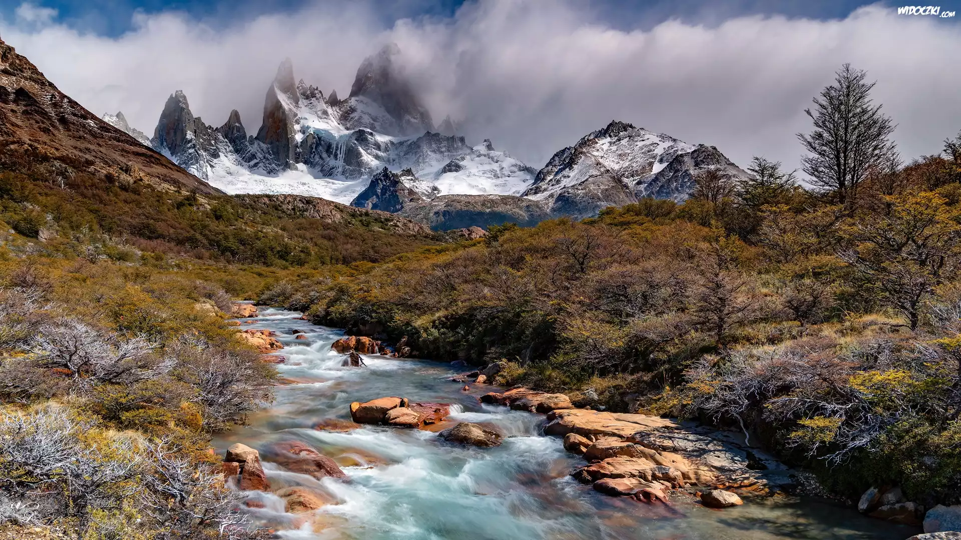 Zdjęcia, Góry Andy, Szczyt Fitz Roy, Rzeka, Kamienie, Drzewa, Roślinność, Chmury, Patagonia, Argentyna