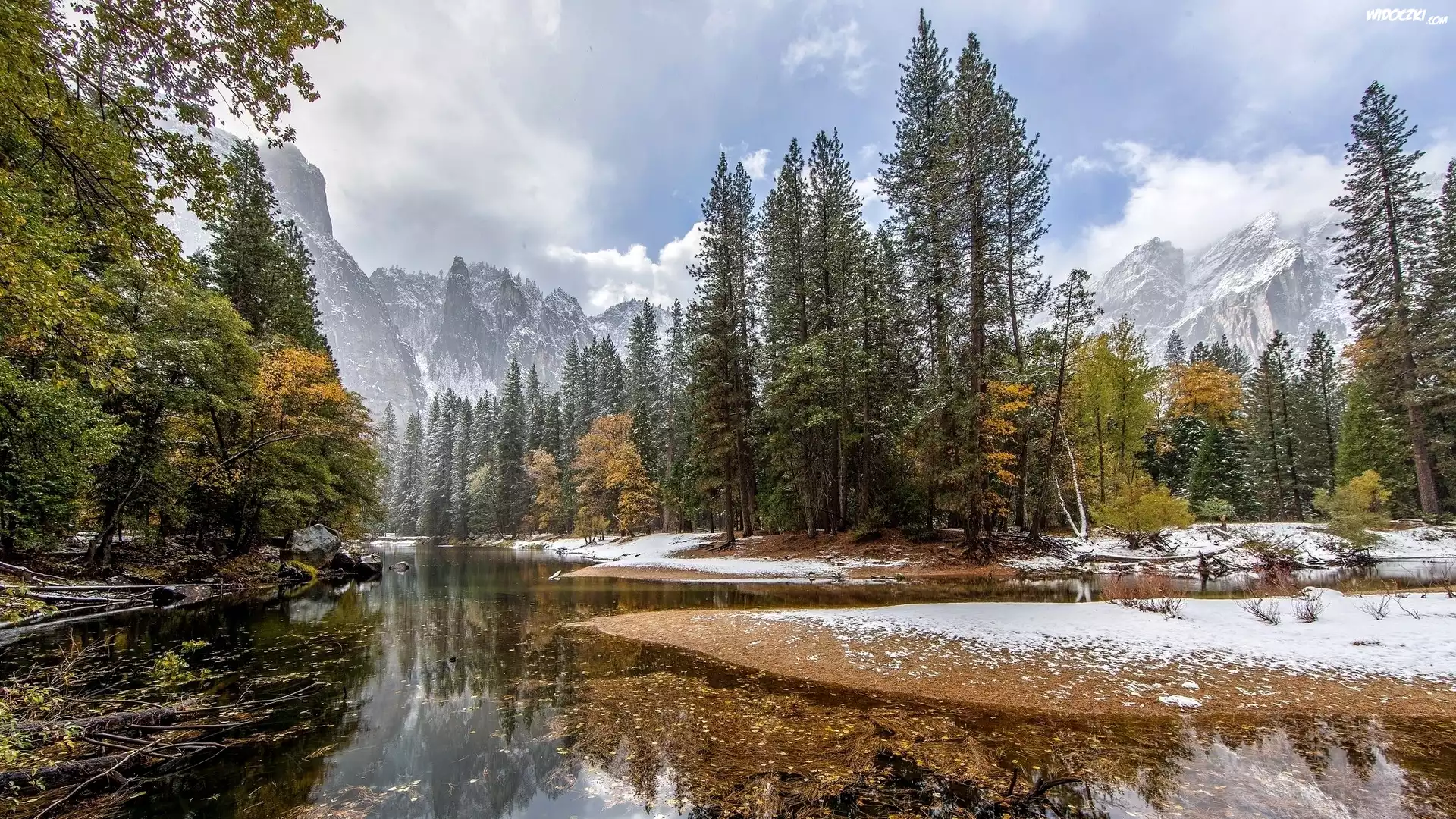 Zdjęcia, Rzeka, Drzewa, Góry, Śnieg