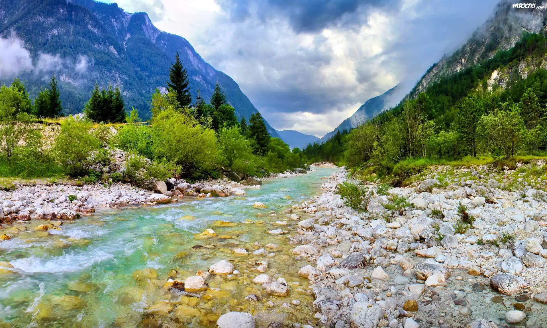 Zdjęcia, Rzeka, Lasy, Kamienie, Góry, Chmury