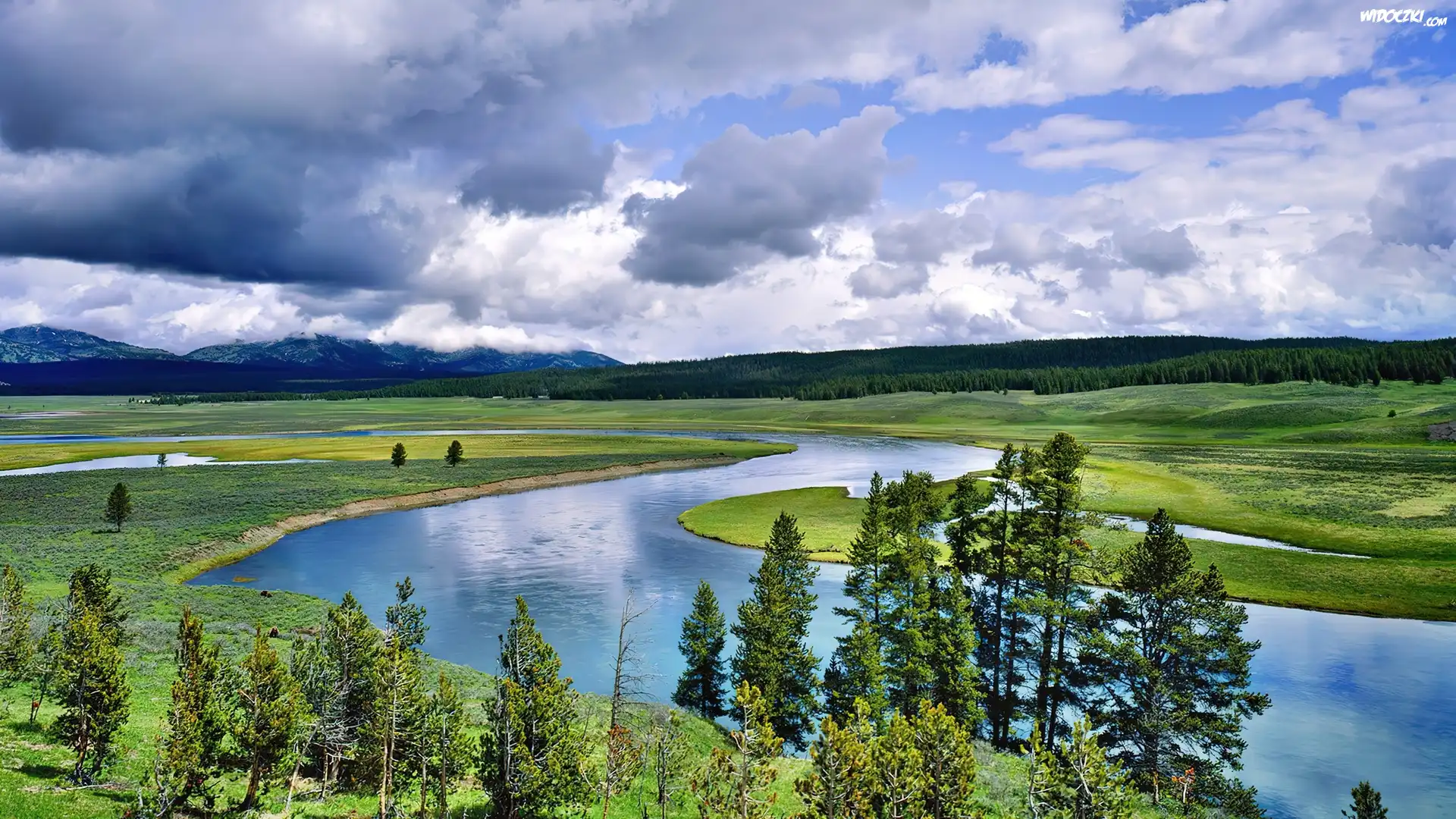 Zdjęcia, Rzeka, Las, Góry, Chmury