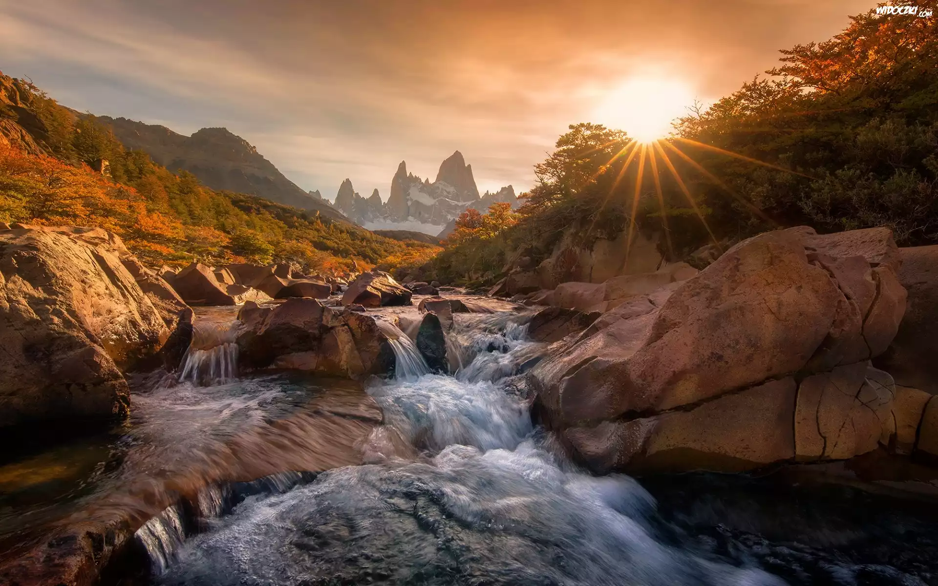 Zdjęcia, Góry, Rzeka, Kamienie, Skała, Drzewa, Promienie słońca