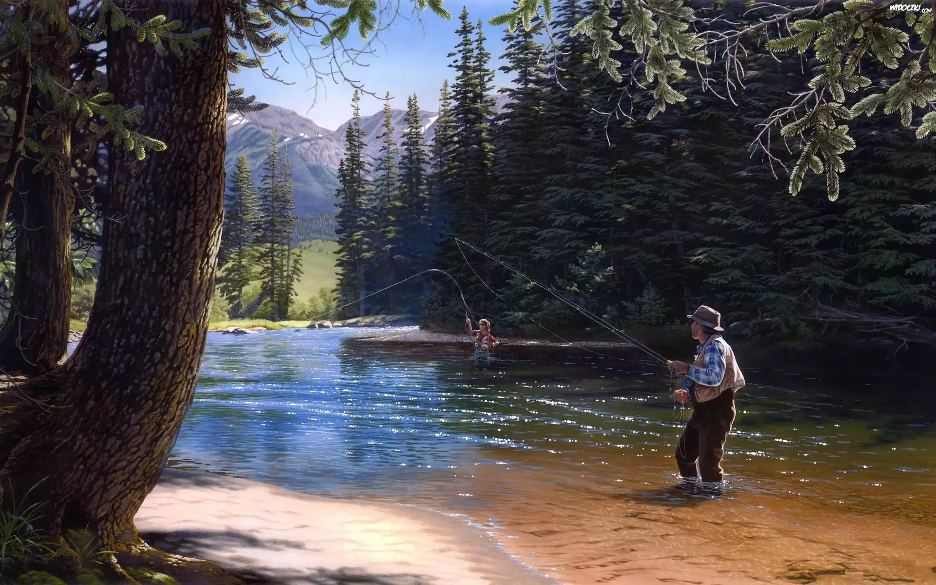 Rzeka, Ludzie, Wędkowanie, Góry, Lasy