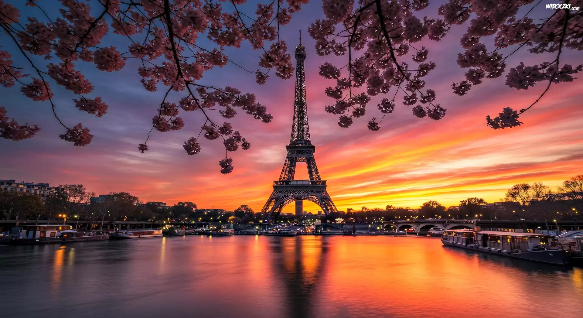 Zdjęcia, Rzeka, Sekwana, Wieża Eiffla, Zachód słońca, Paryż, Francja, Grafika AI