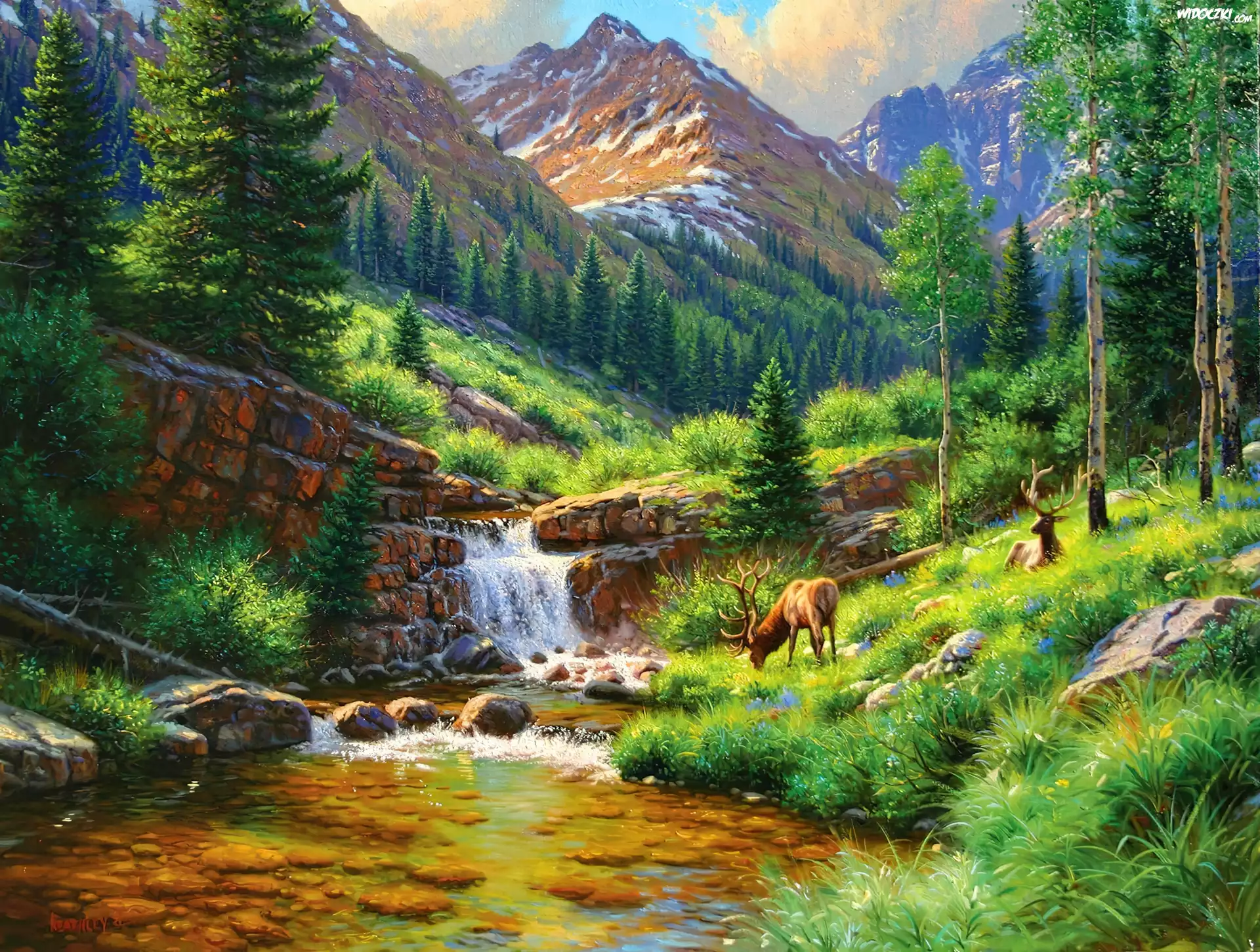 Rzeka, Góry, Las, Jelenie, Widoczek