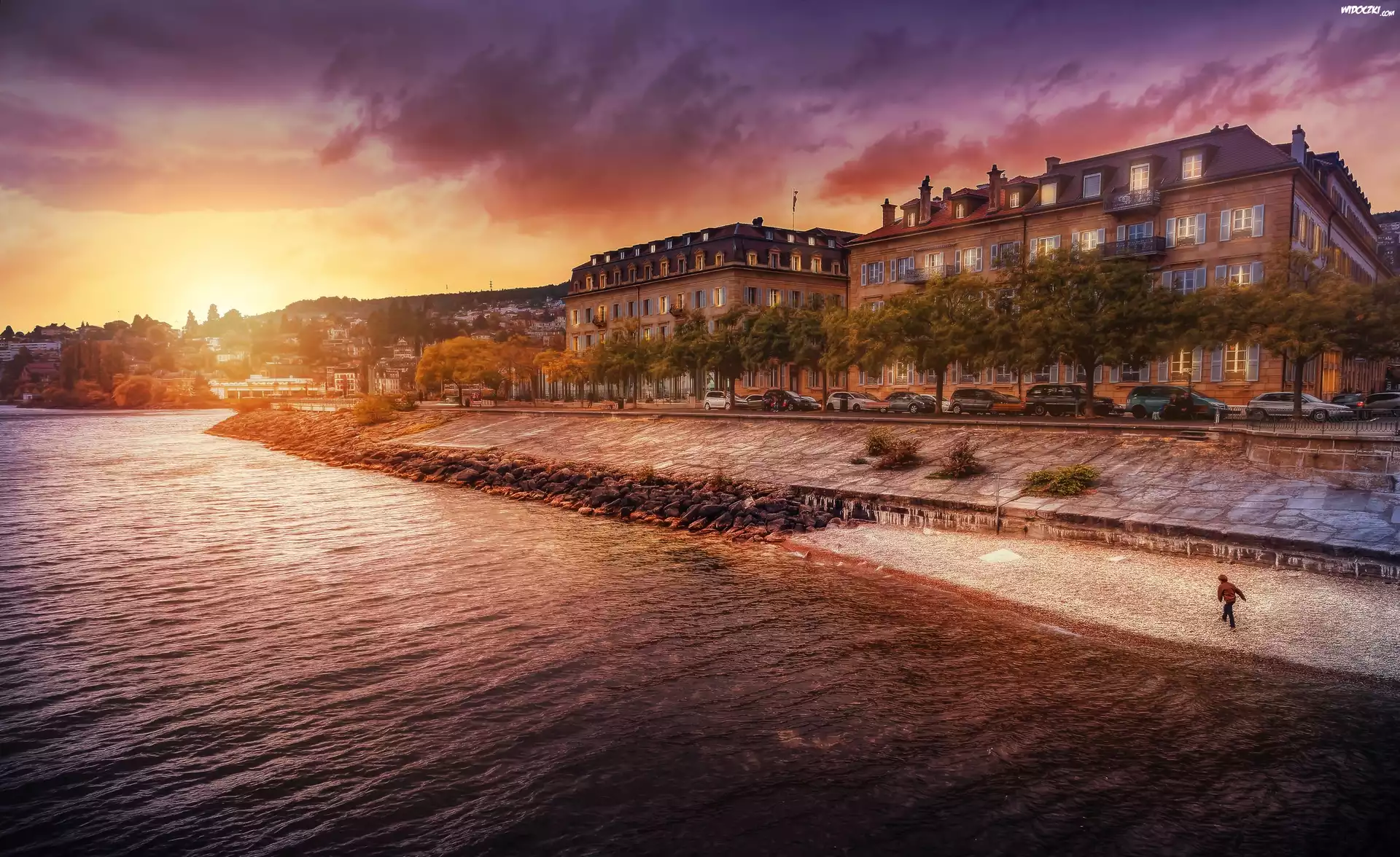 Zdjęcia, Rzeka, Domy, Jesień, Samochody