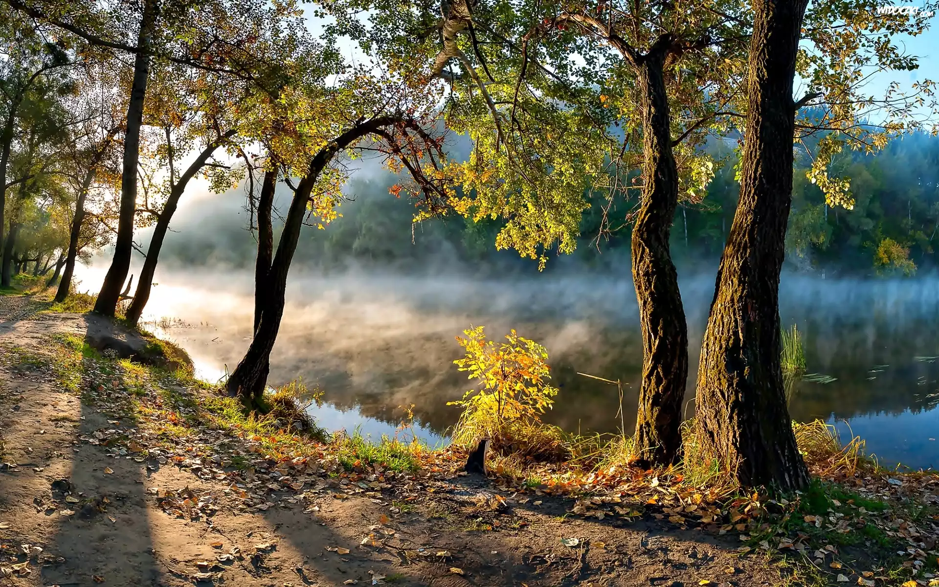Rzeka, Brzeg, Drzewa, Jesień, Mgła